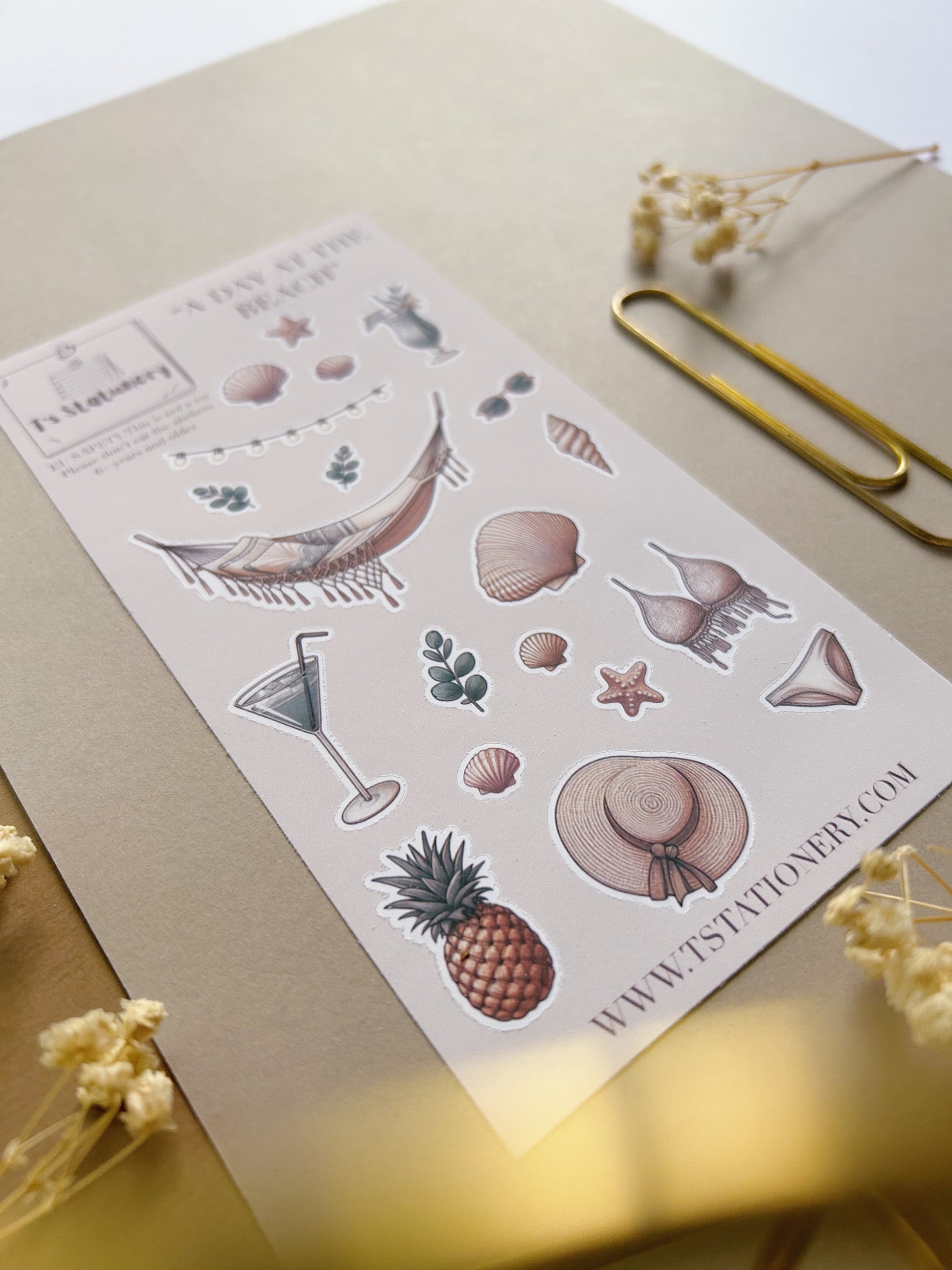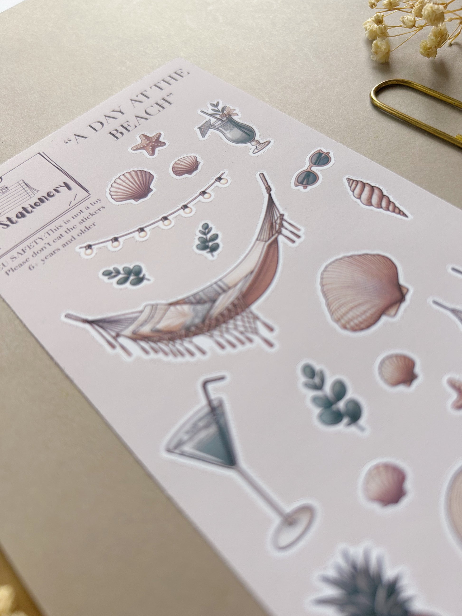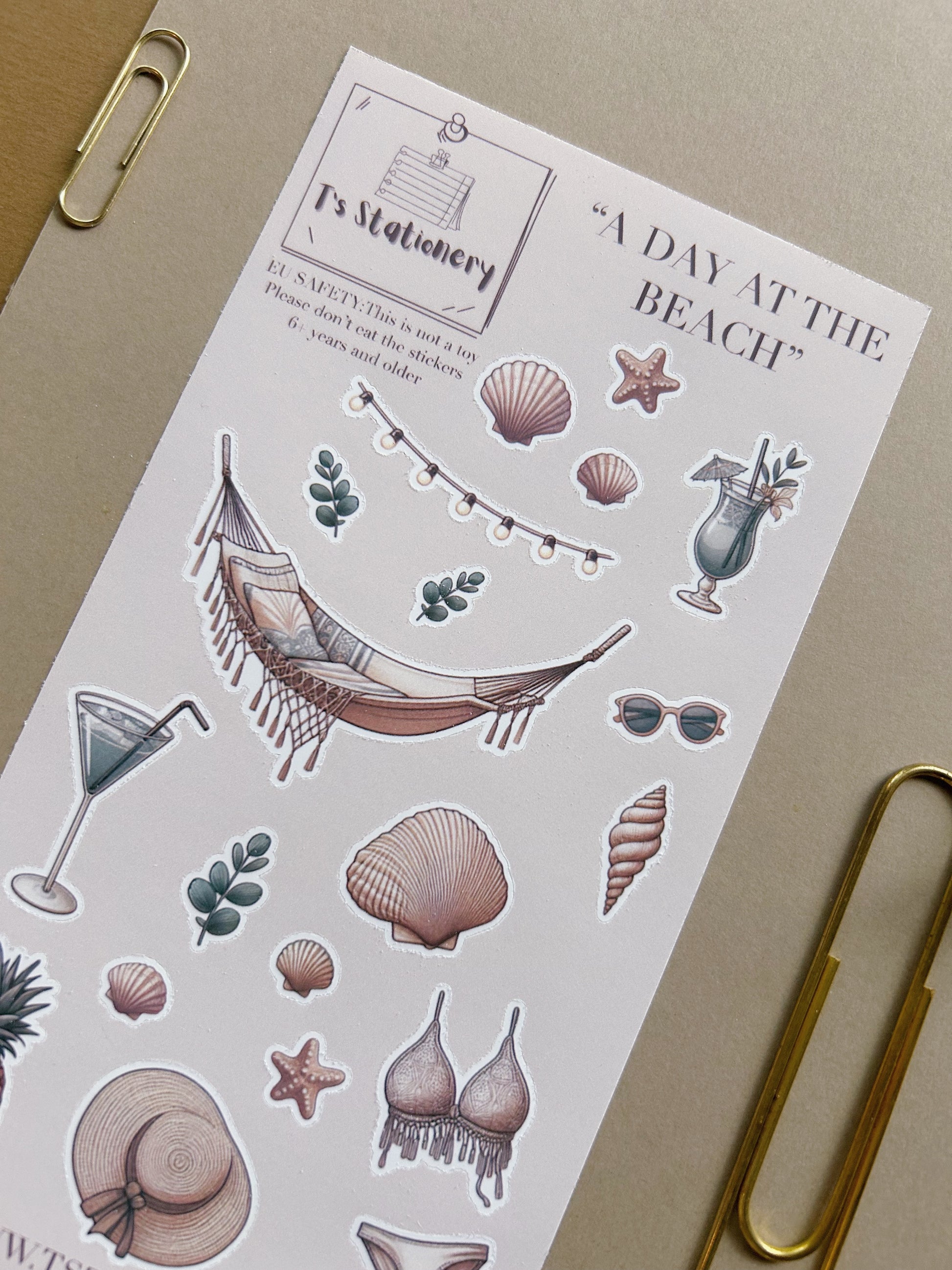 "A day at the beach" sticker sheet, perfect to use in your journal or scrapbook this upcoming summer. With a very cozy hammock included!