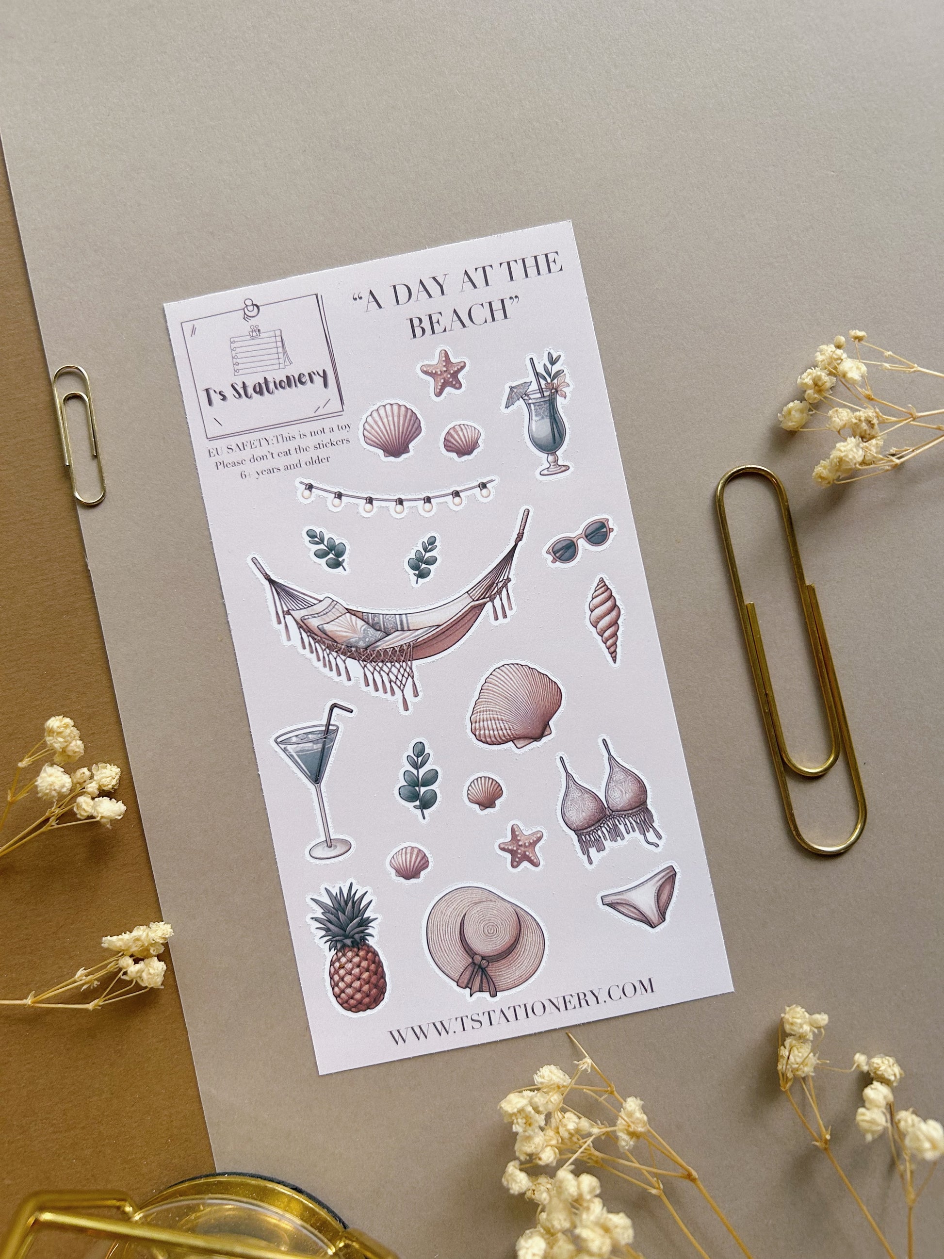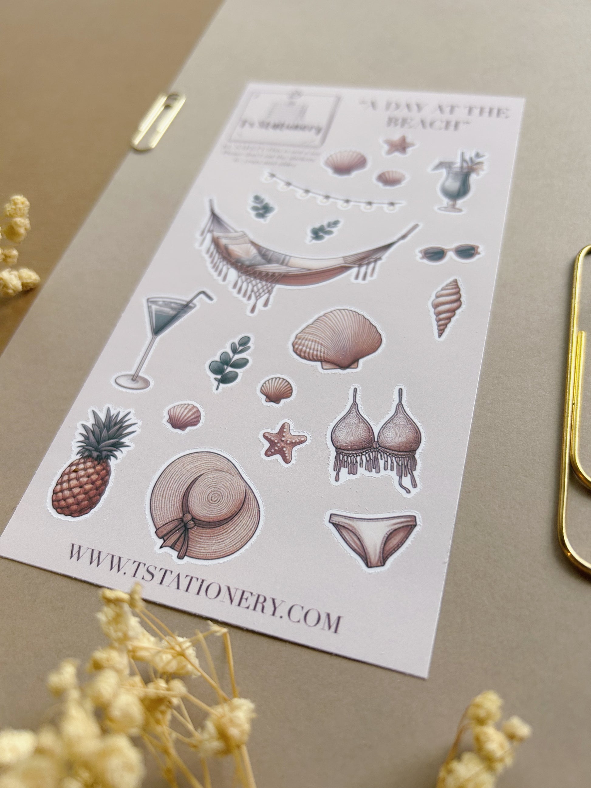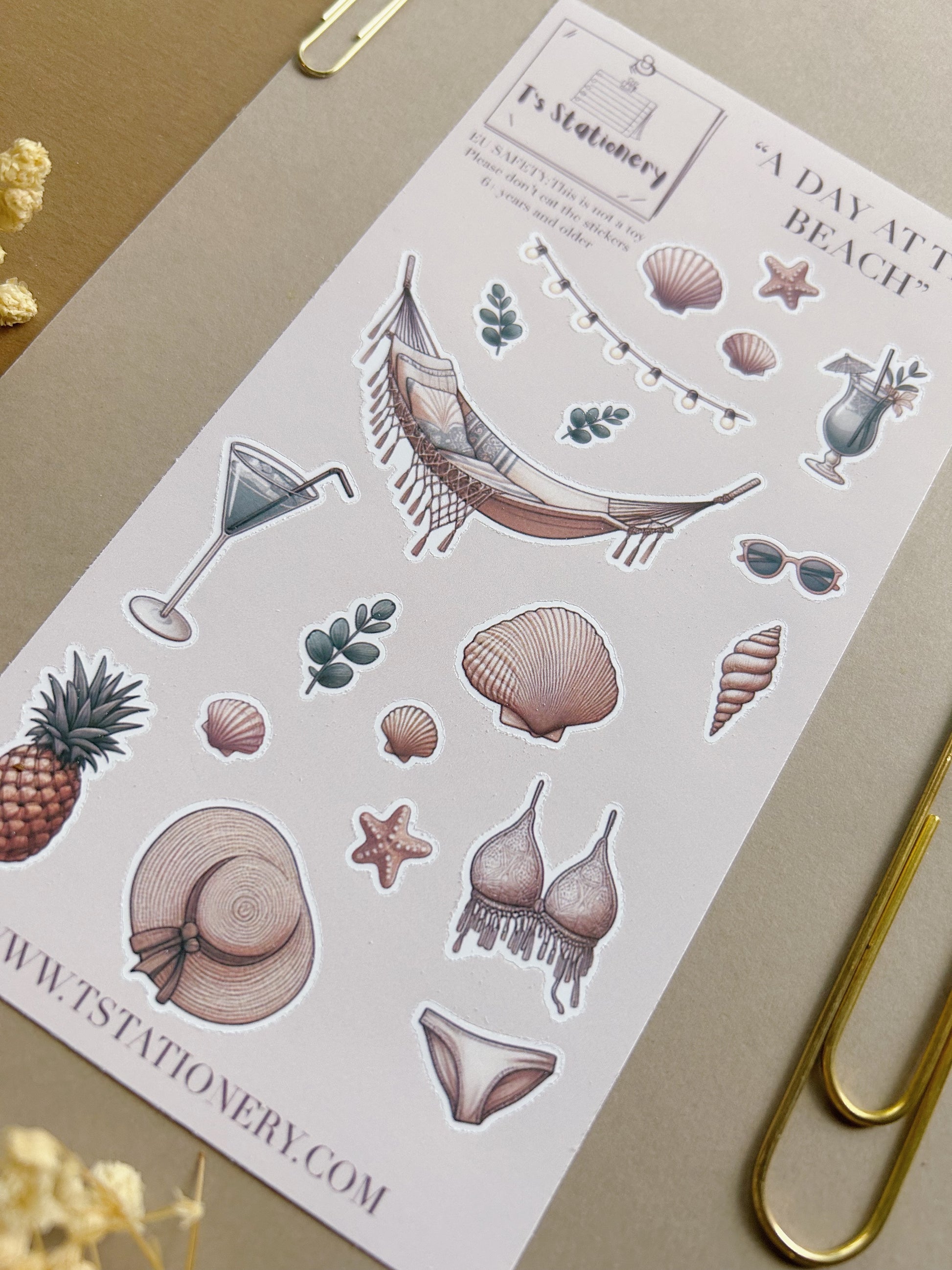 "A day at the beach" sticker sheet, perfect to use in your journal or scrapbook this upcoming summer. With a very cozy hammock included!