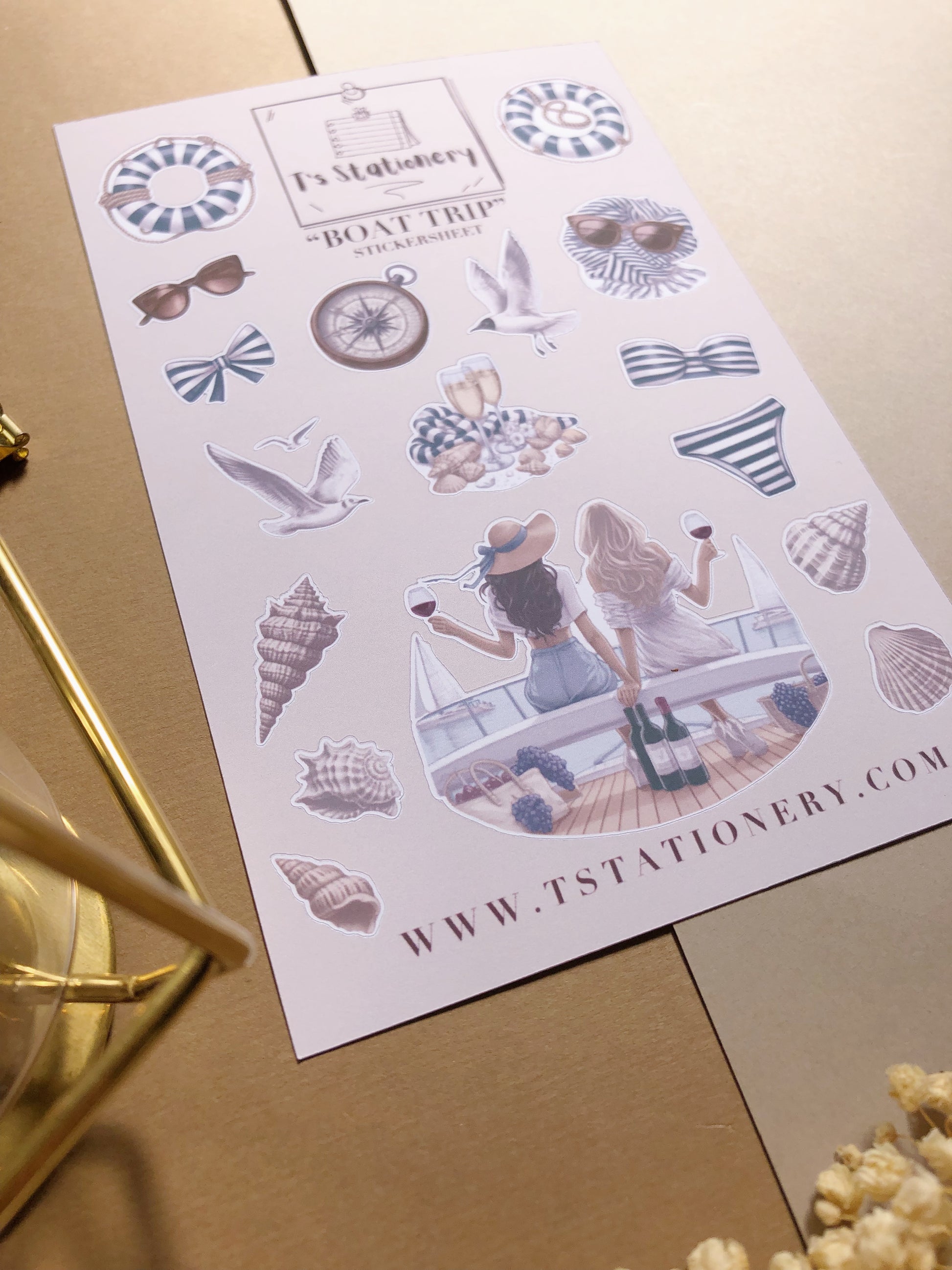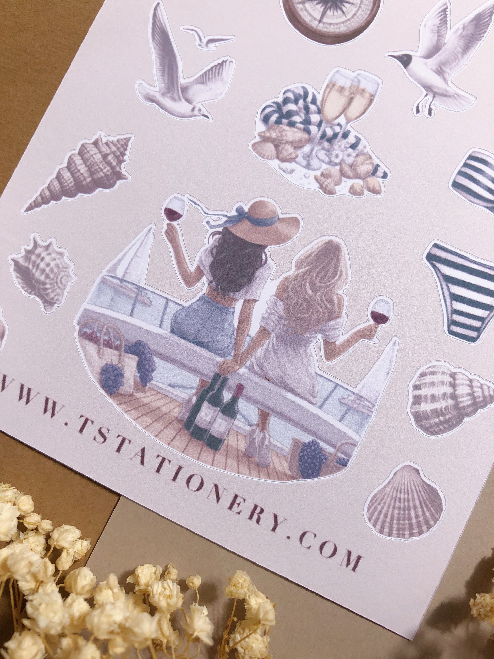 These boat trip stickers will give your journal, planner or scrapbook a fresh late spring/early summer vibe. The sticker sheet is filled with a few seagulls, some lifebuoys, seashells, 2 girls sitting on a boat cheering with glasses of wine, some sunglasses and much more! I designed this sticker sheet myself and I used my Cricut machines (Cricut Explore and Maker) to cut them. The stickers all have a small white lining at the edges.