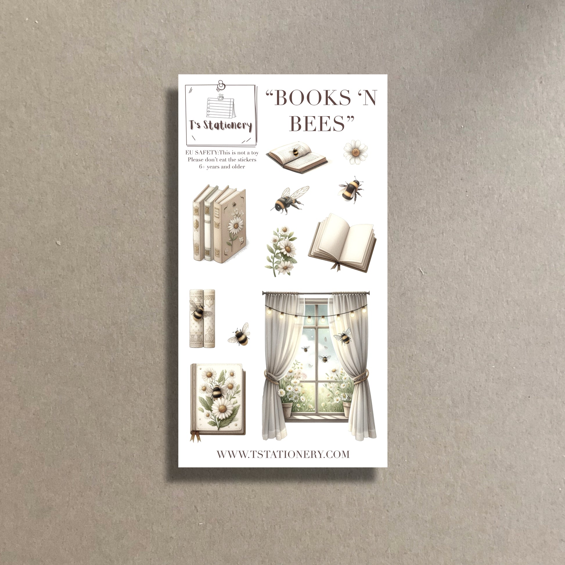 A sticker sheet full with books and bees. This sticker sheet is perfect to use in your Bullet Journal, planner or scrapbook.