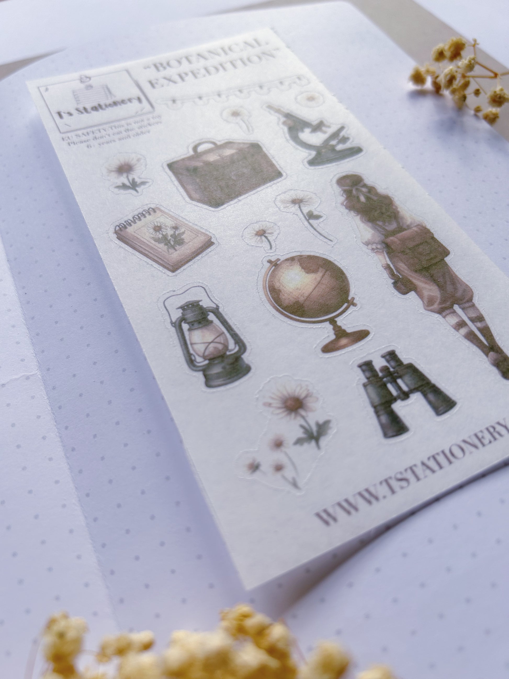 These botanical expedition stickers will give your journal, planner or scrapbook a cozy and relaxed spring/summer vibe. I designed this sticker sheet myself and I used my Cricut machines (Cricut Explore and Maker) to cut them. The stickers all have a small white lining at the edges.