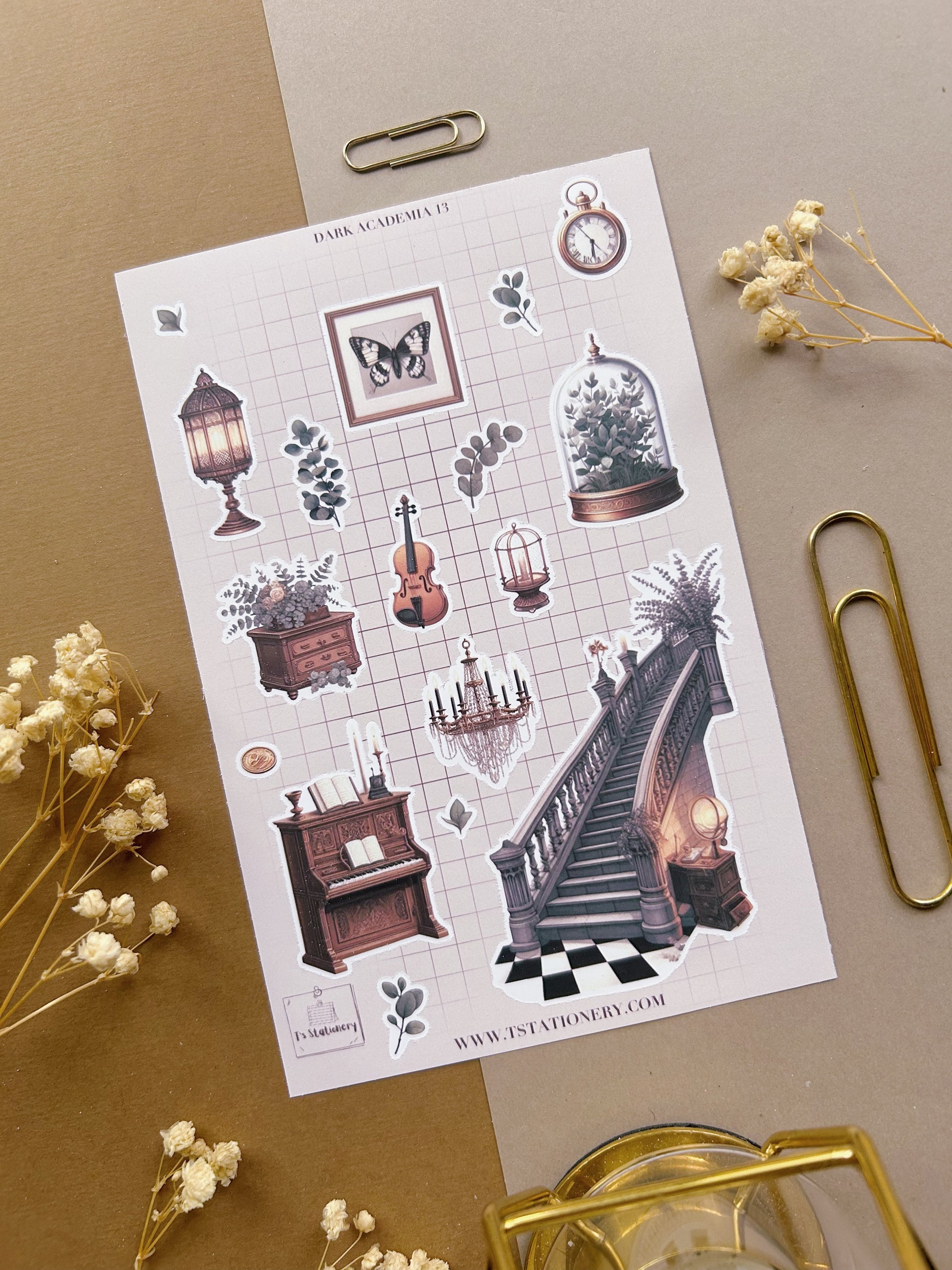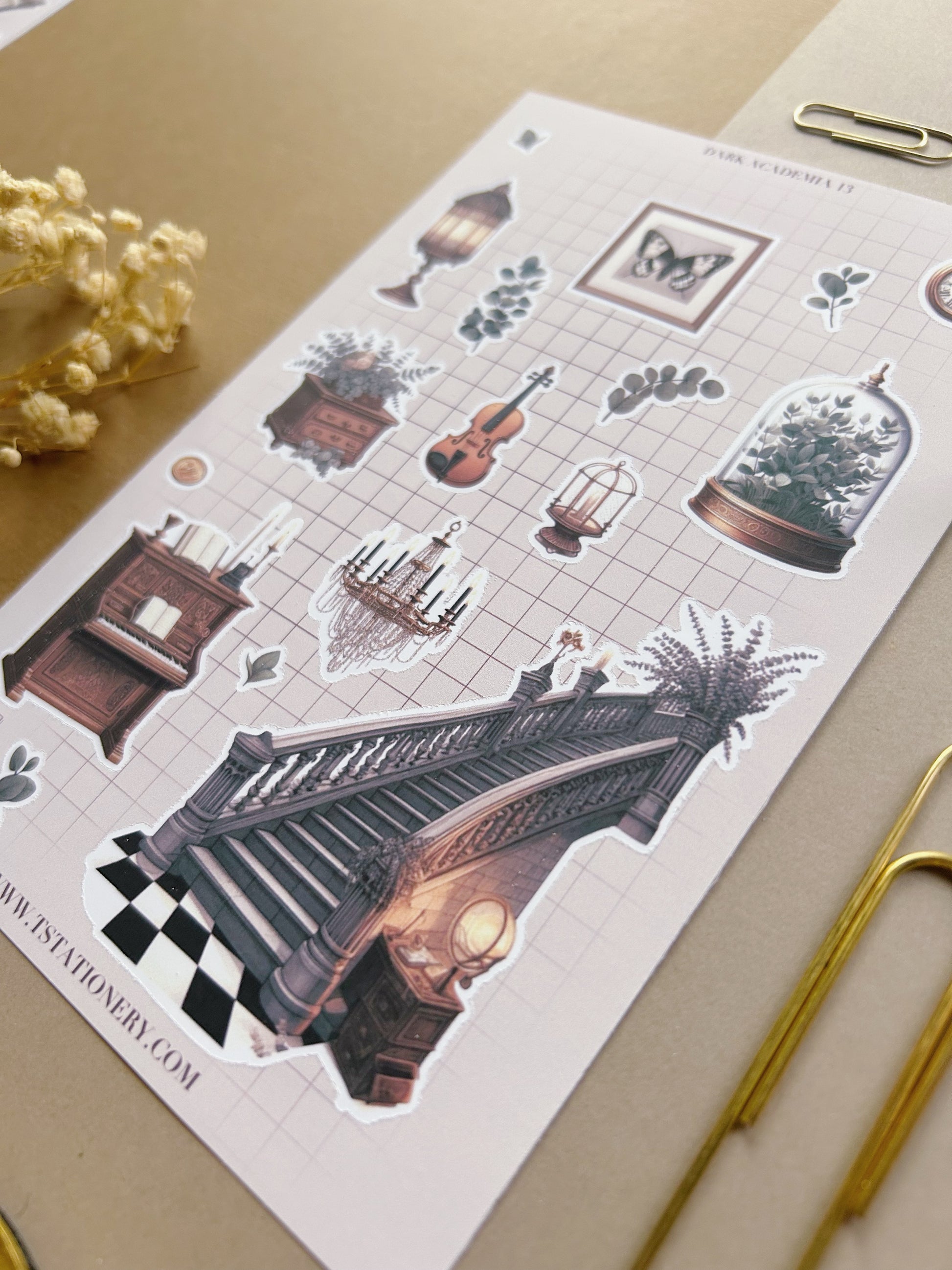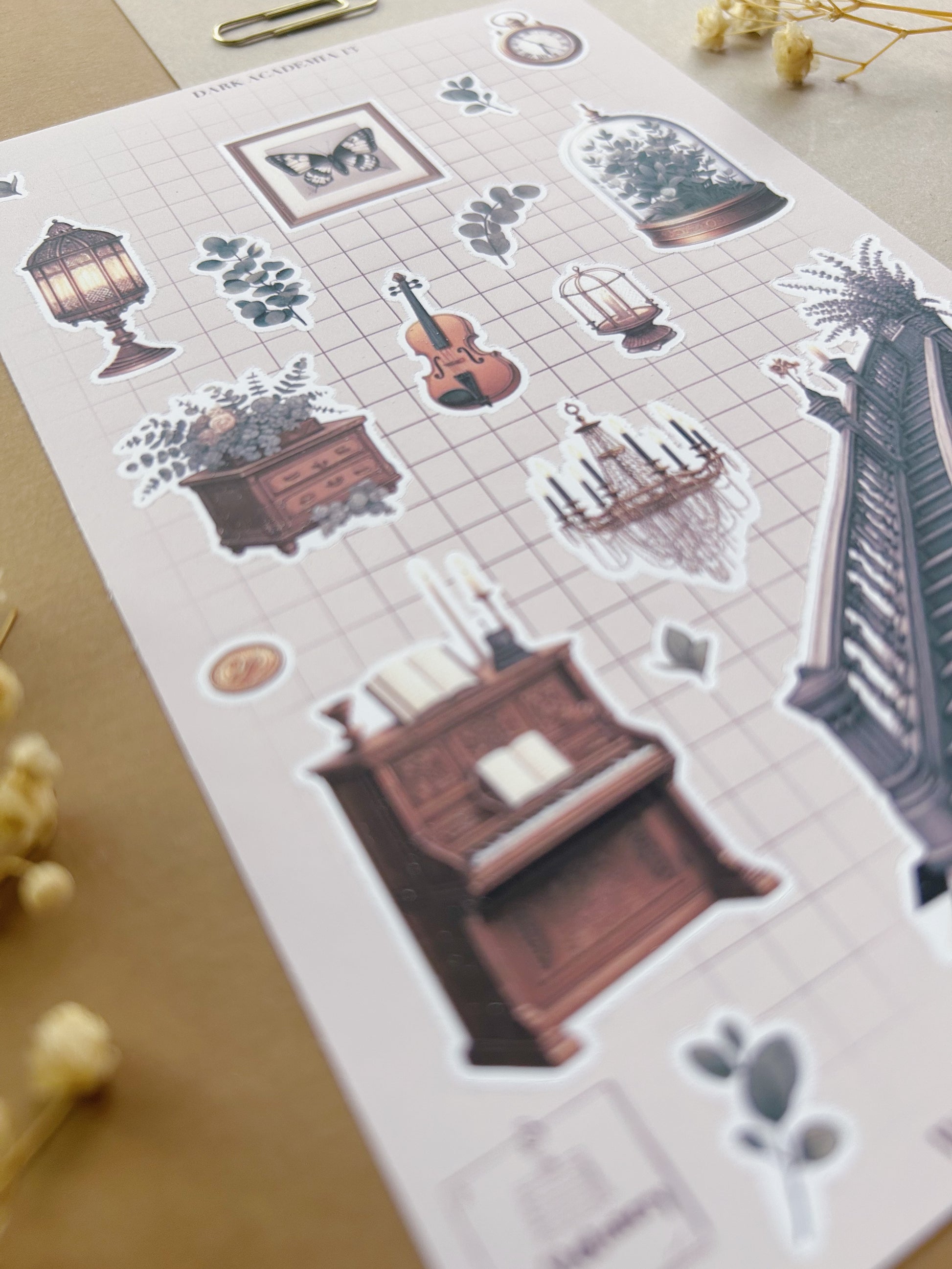 A dark academia sticker sheet, which is part of the new dark academia collection. It's perfect to use in your (reading) journal, planner or scrapbook. There are enough book stickers to play around with.