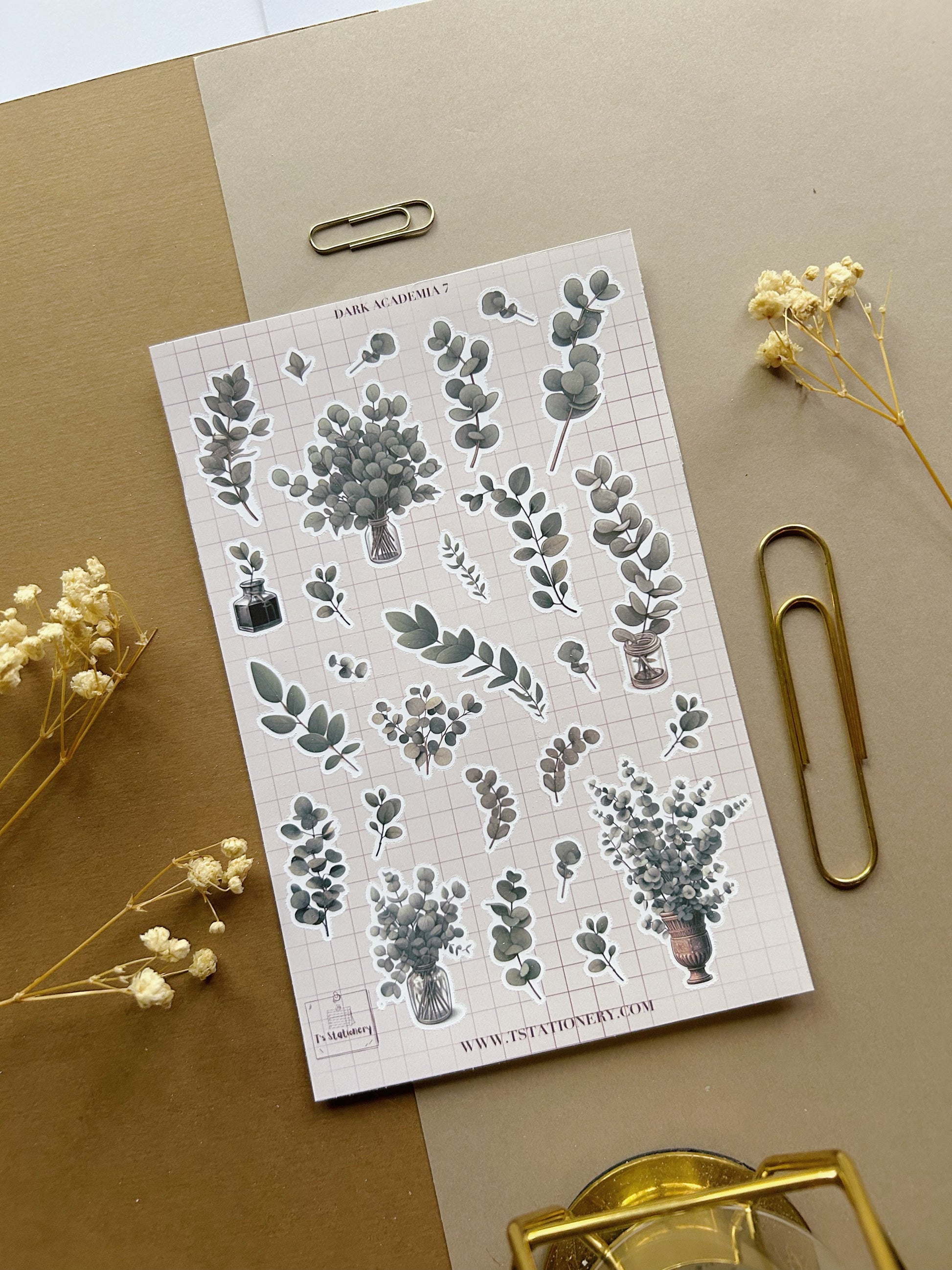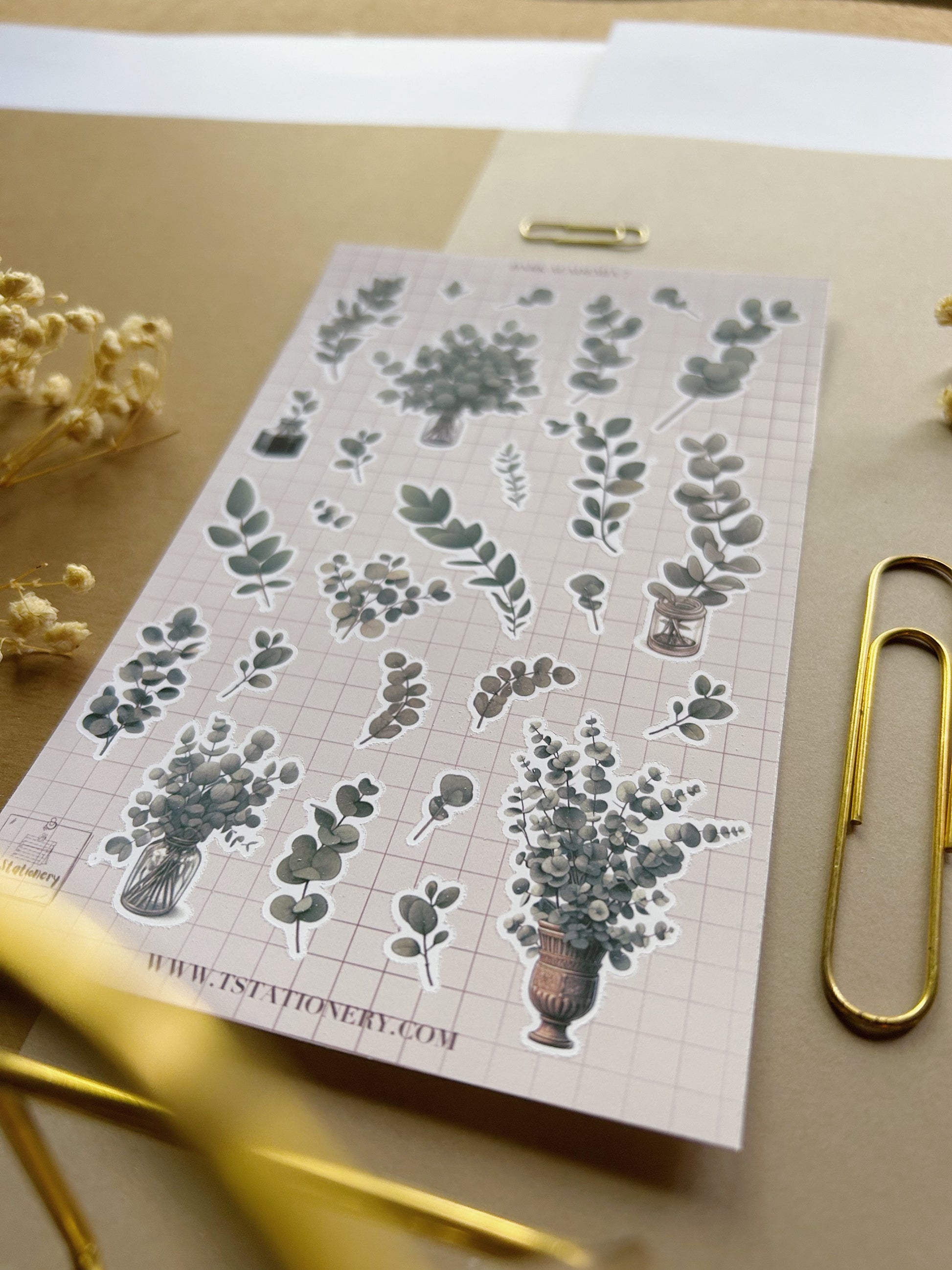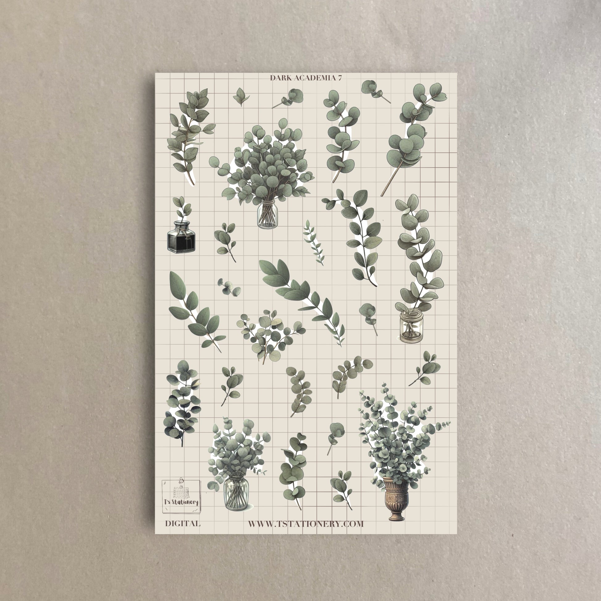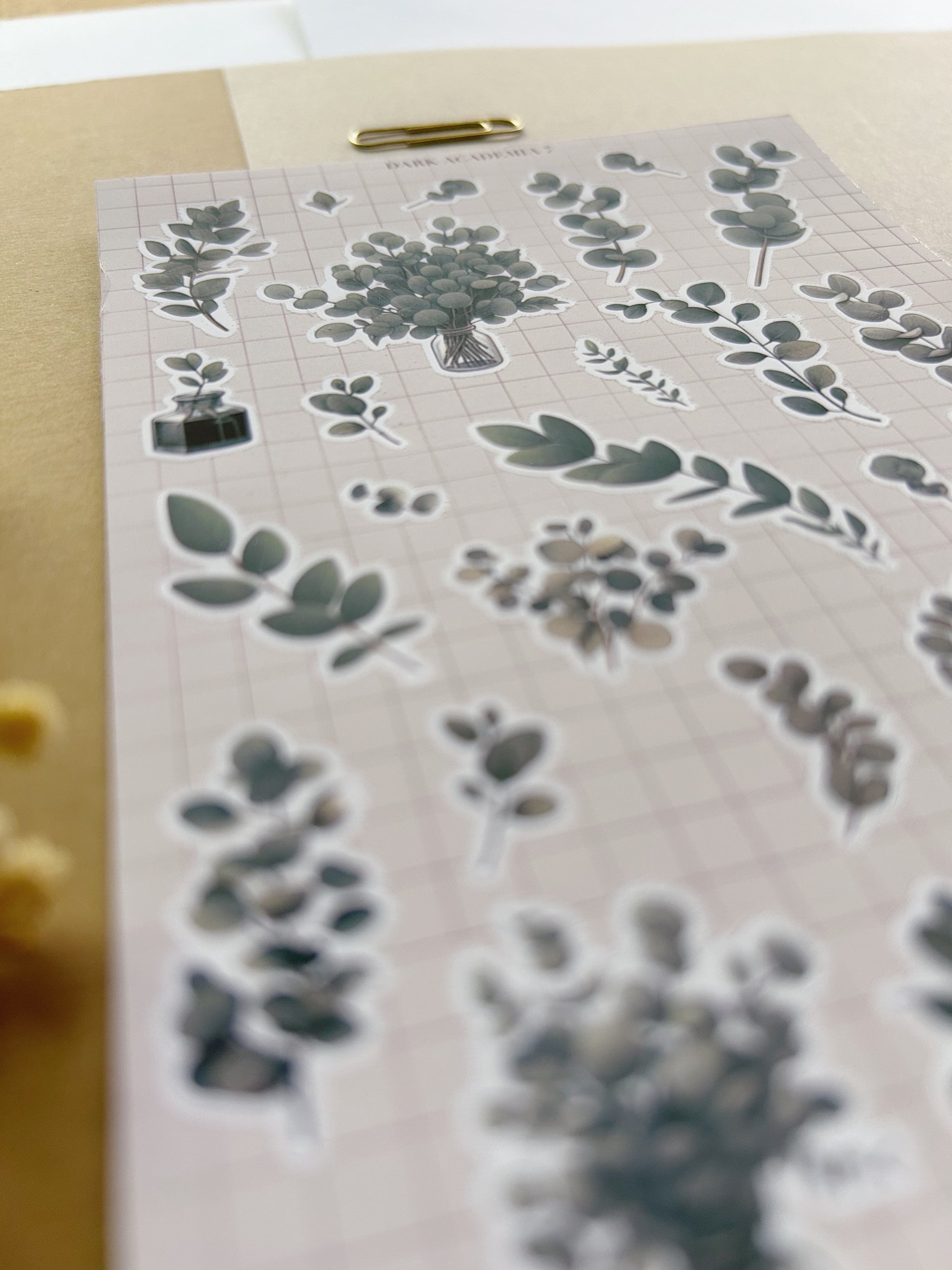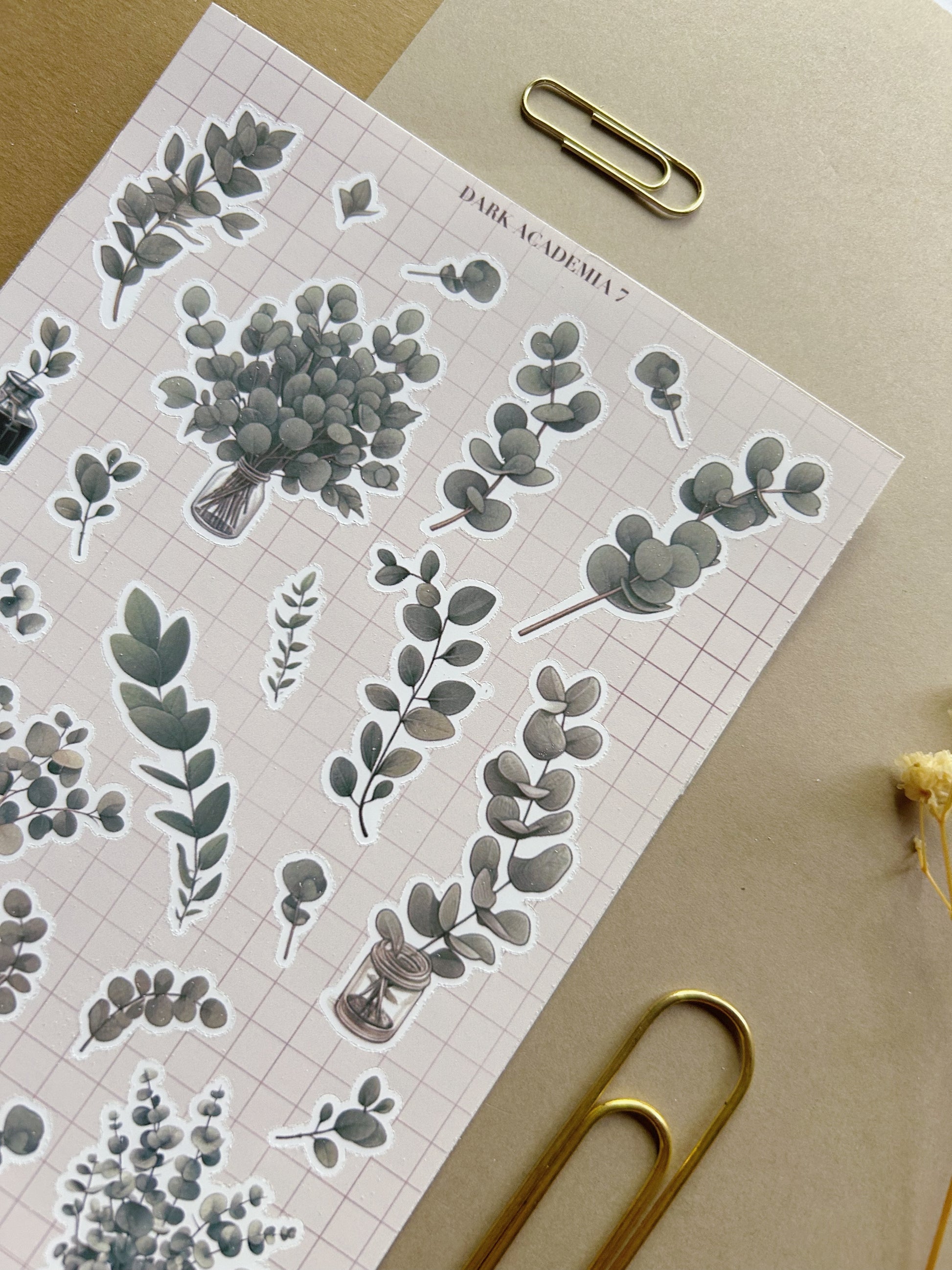 A new dark academia sticker sheet, perfect to use in your journal, planner or scrapbook. Filled with enough eucalyptus foliage to play around with.