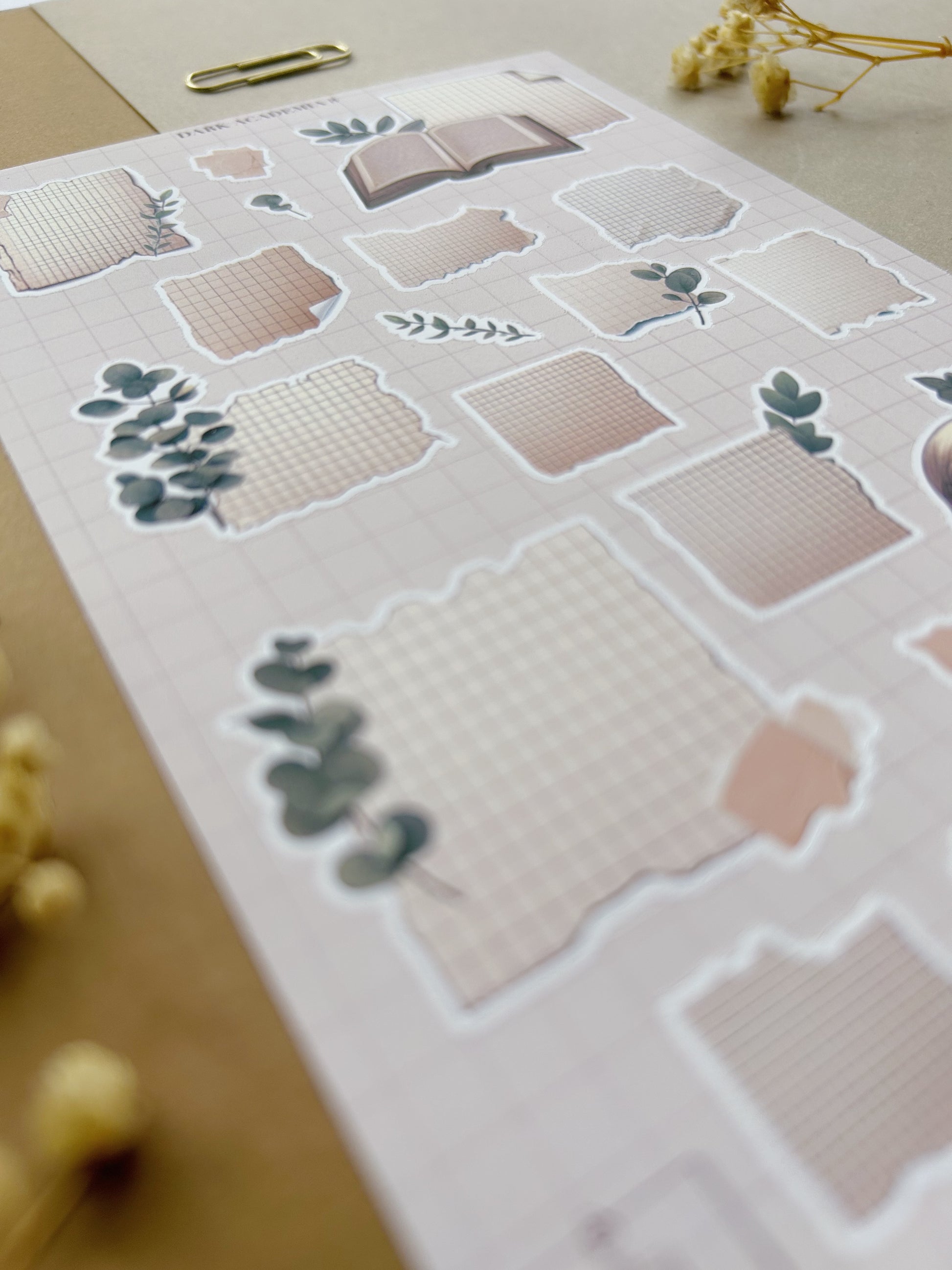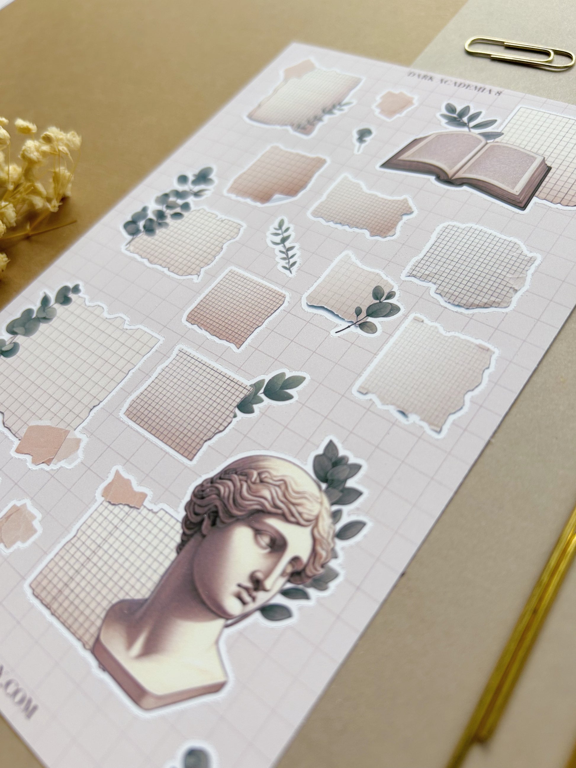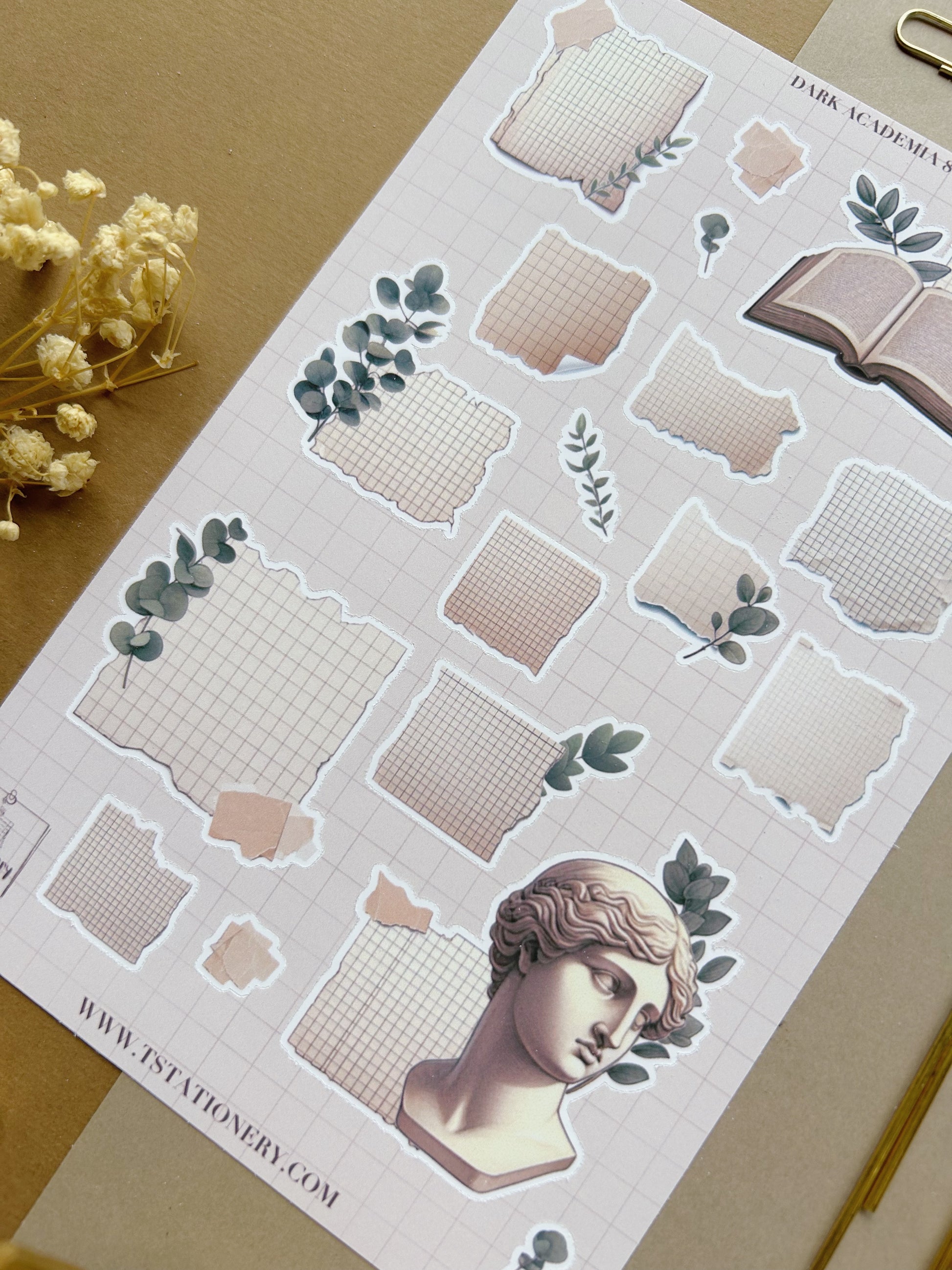 A dark academia themed sticker sheet with paper scrap stickers, which is part of the new dark academia collection. The stickers are perfect to use in your (reading) journal, planner or scrapbook. There are enough stickers to play around with.