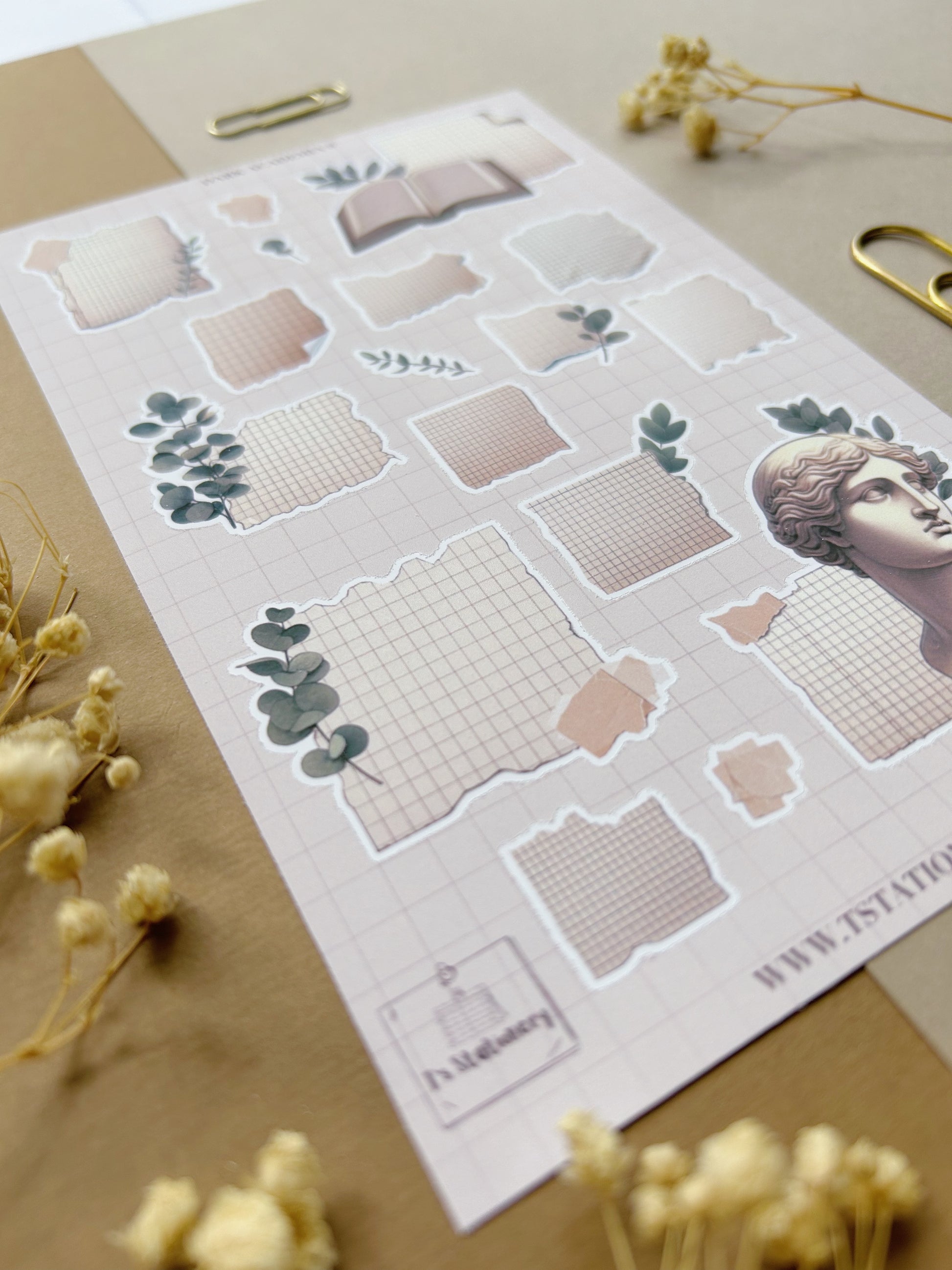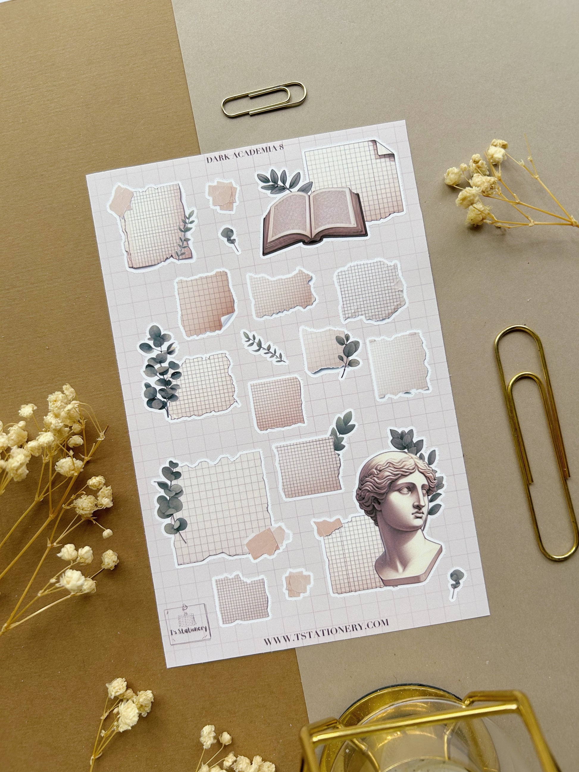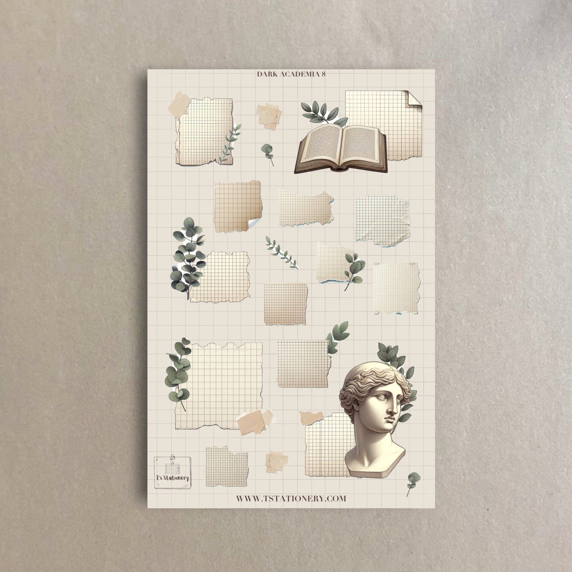 A dark academia themed sticker sheet with paper scrap stickers, which is part of the new dark academia collection. The stickers are perfect to use in your (reading) journal, planner or scrapbook. There are enough stickers to play around with.