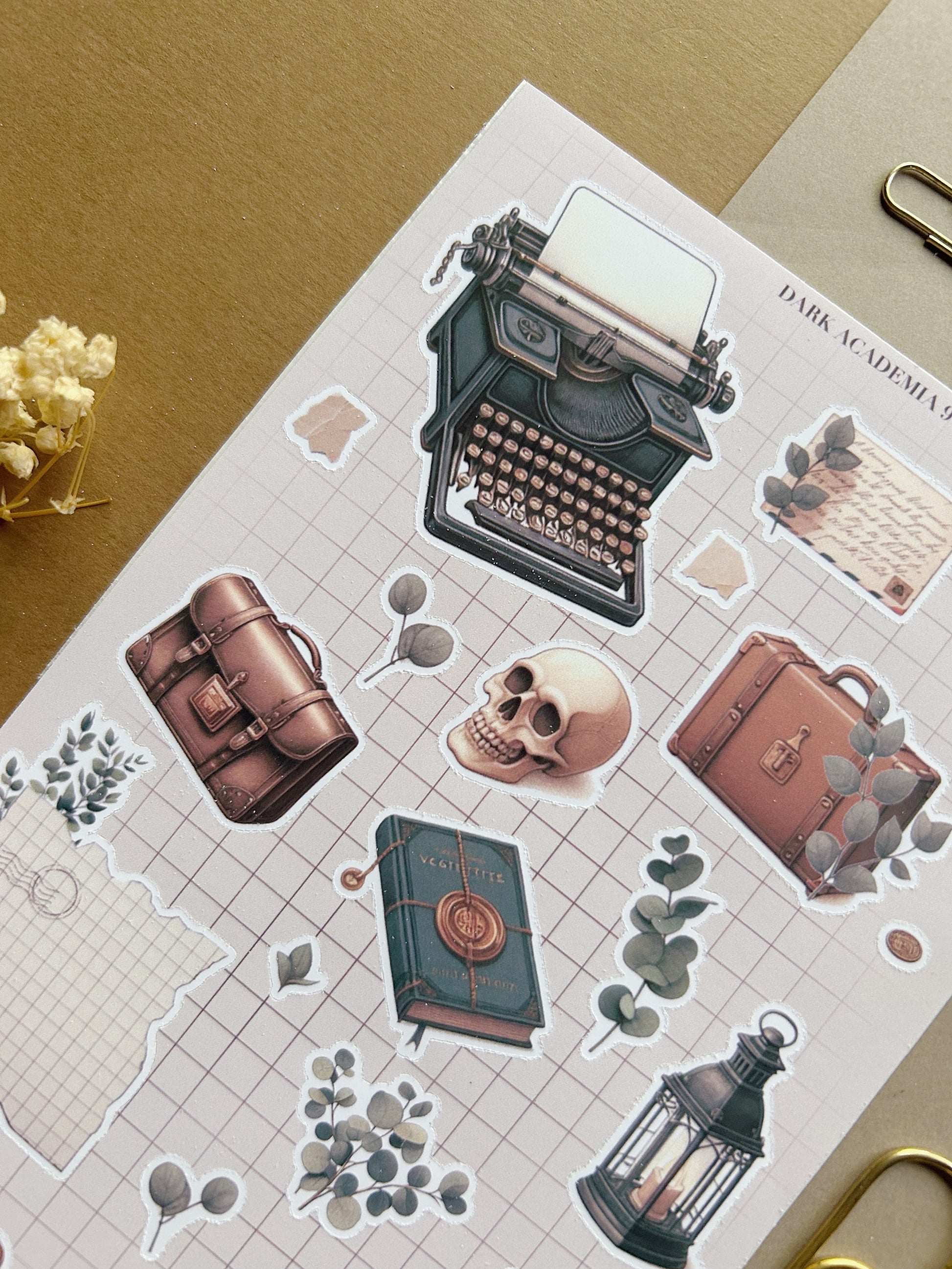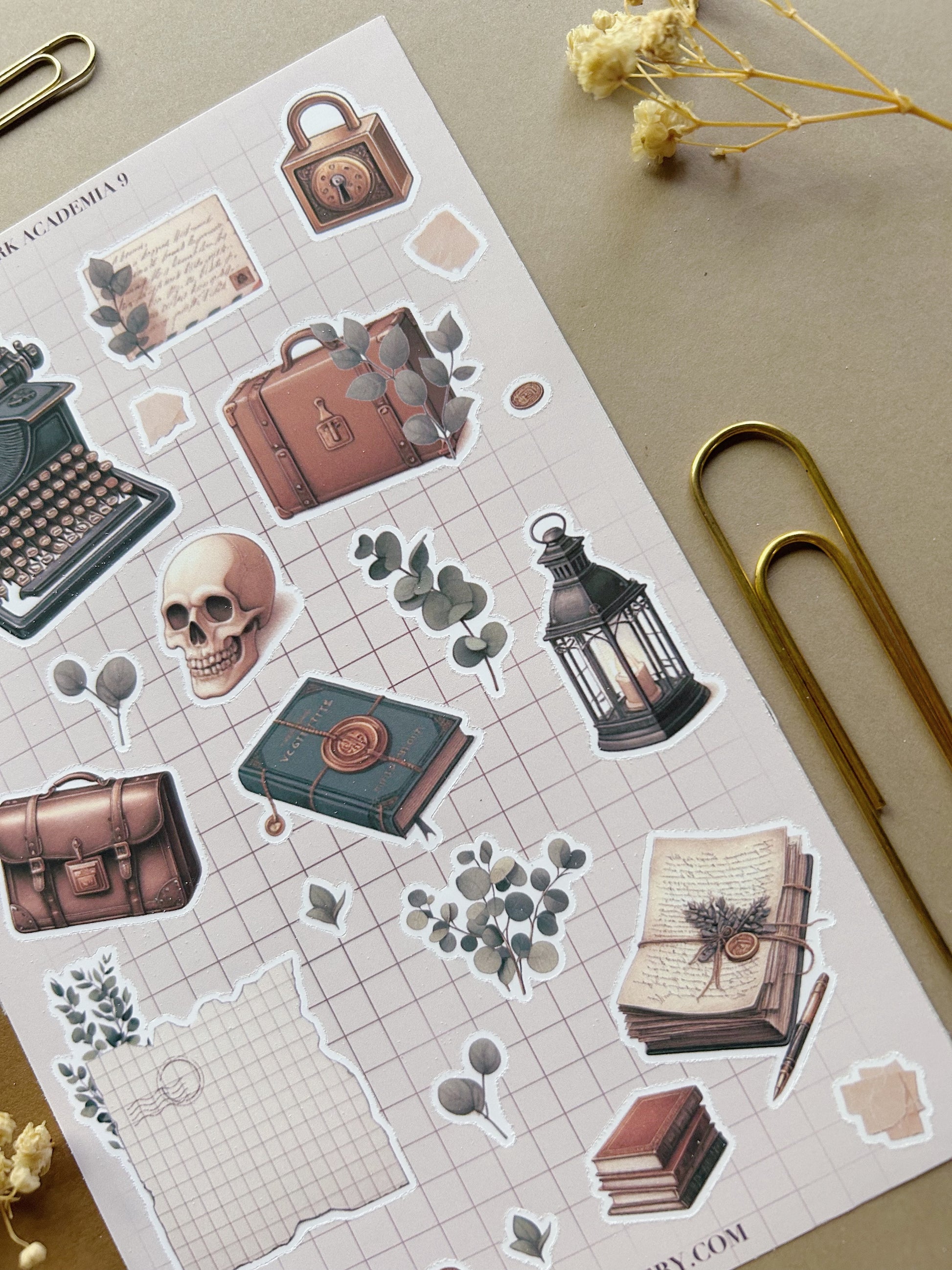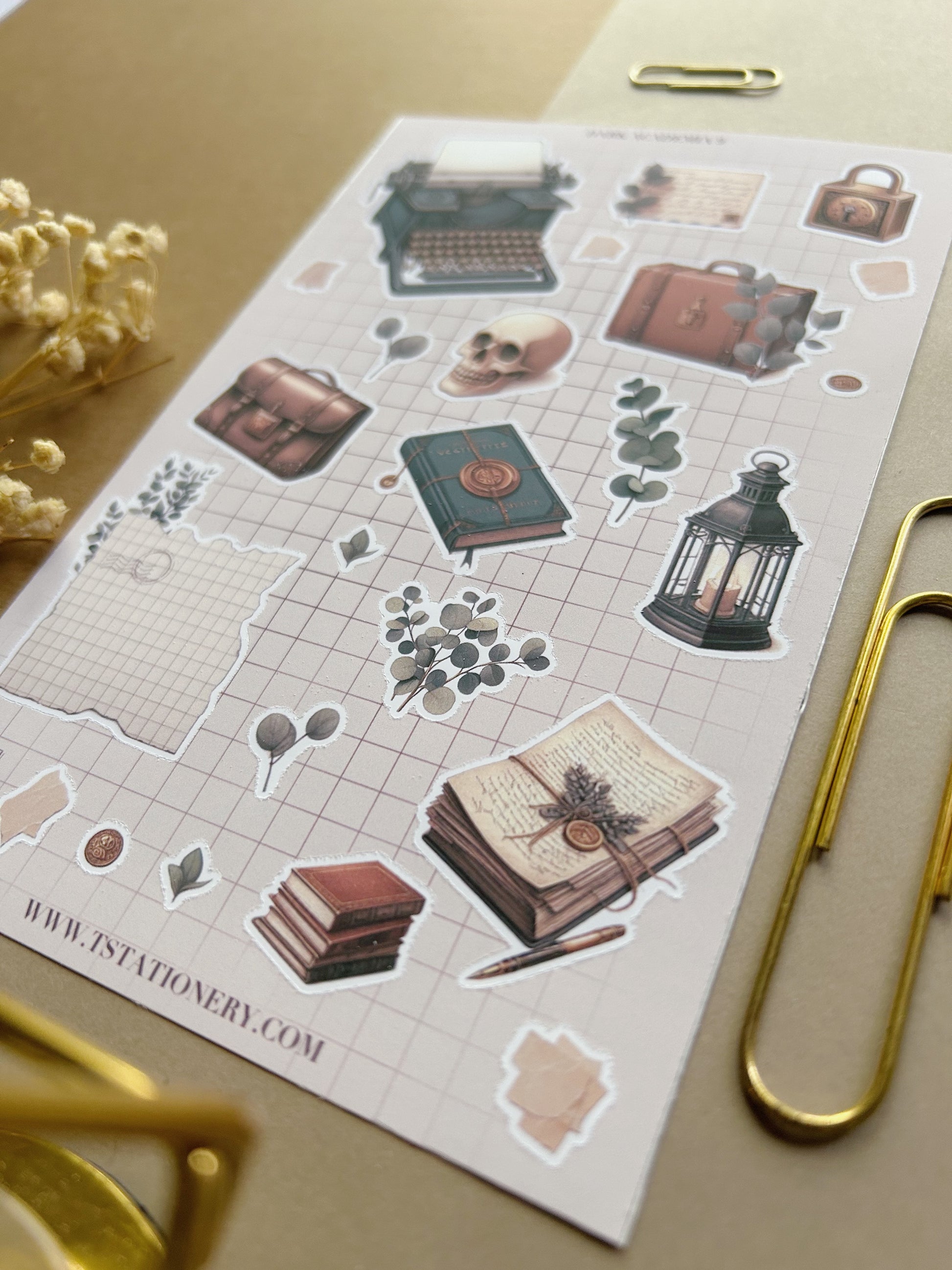 A dark academia sticker sheet, which is part of the new dark academia collection. It's perfect to use in your (reading) journal, planner or scrapbook. There are enough book stickers to play around with.