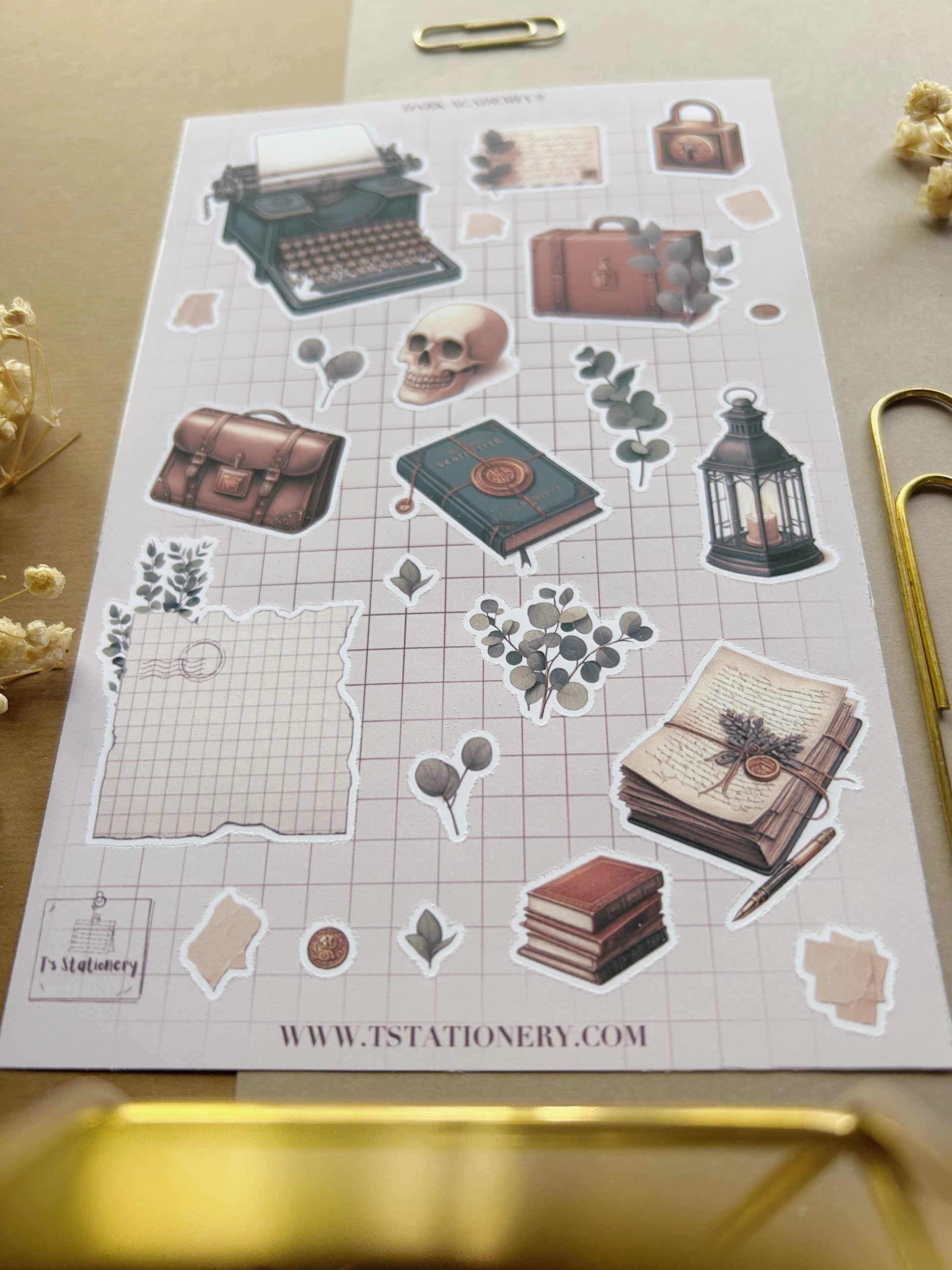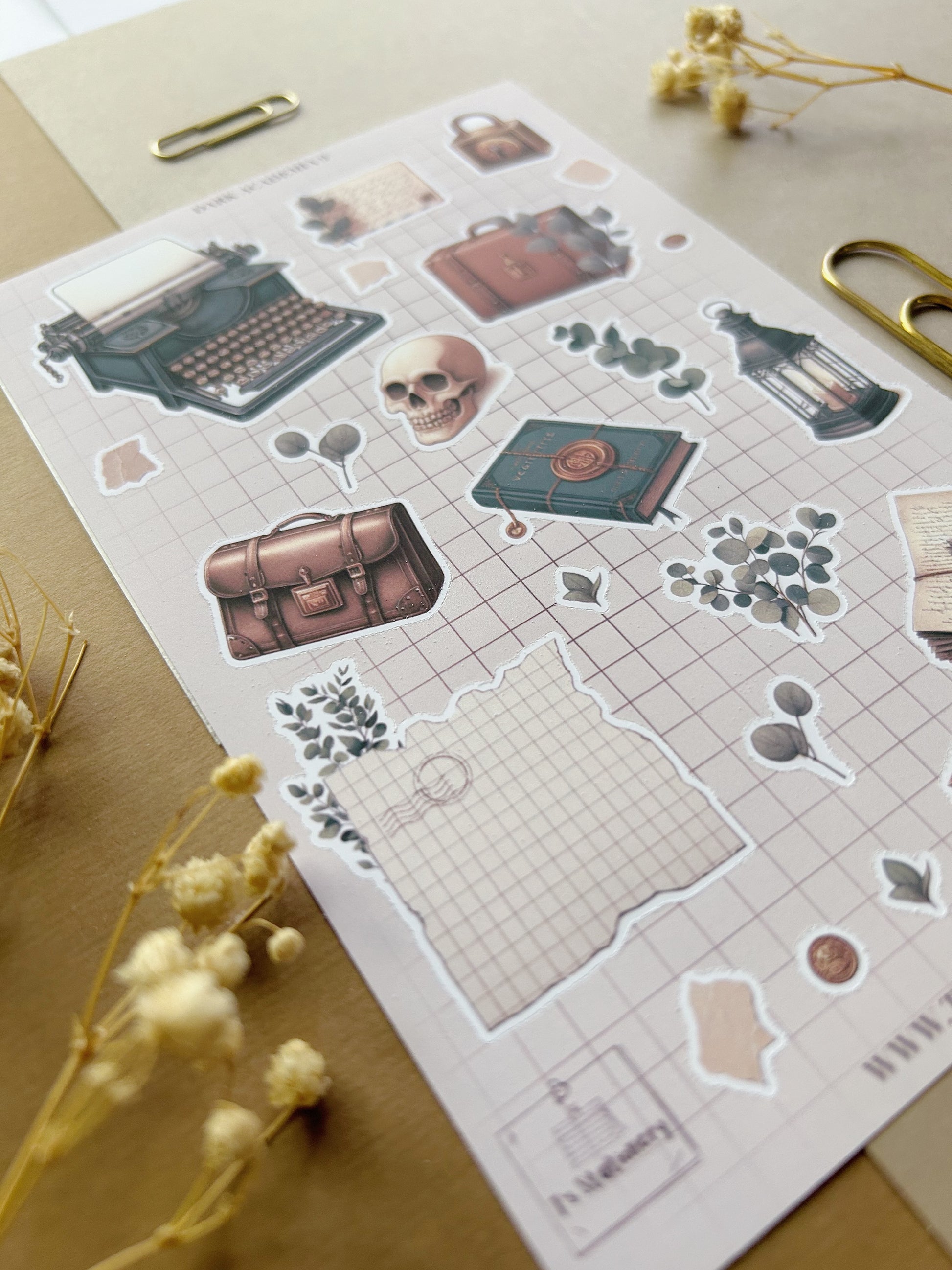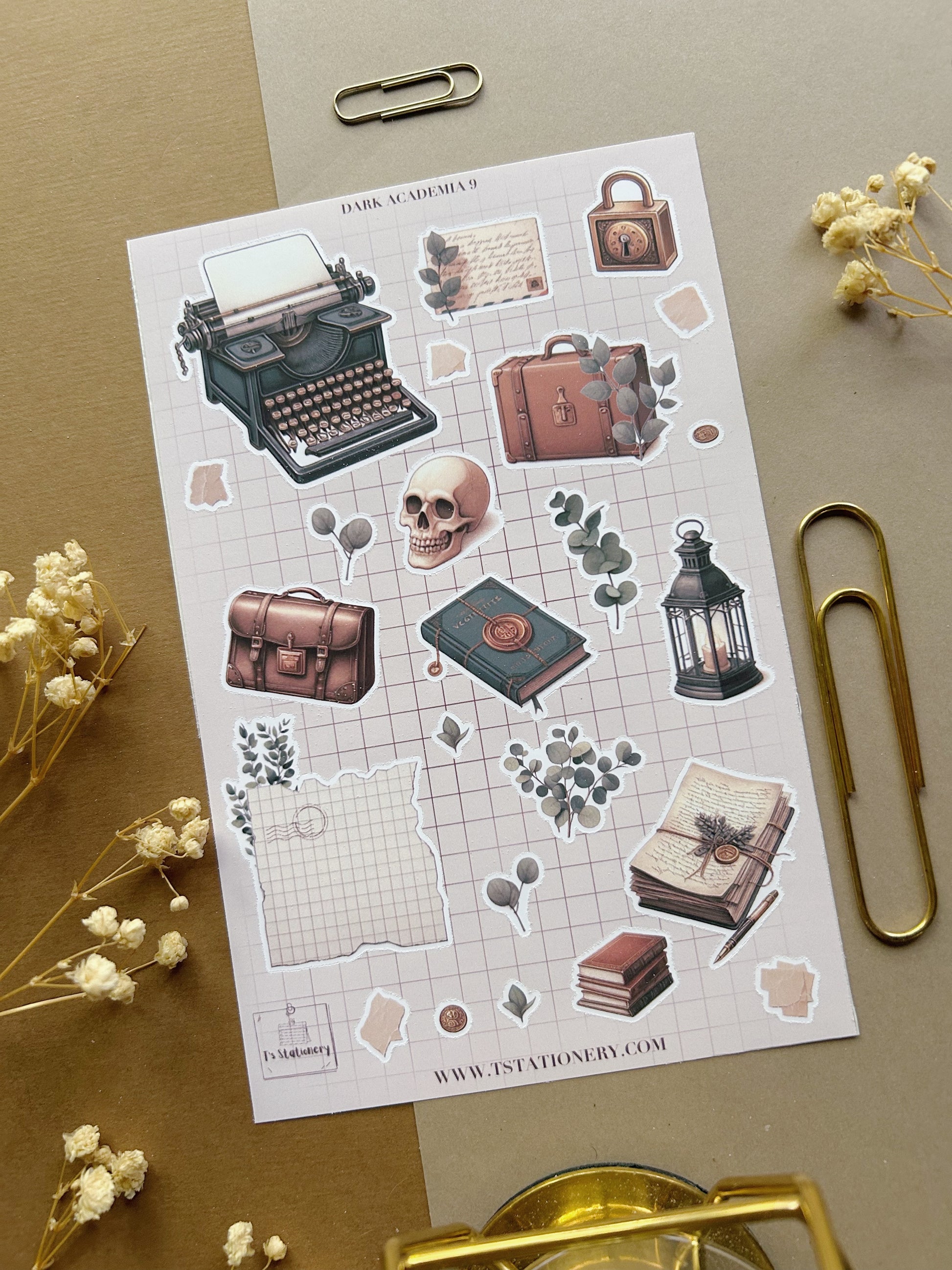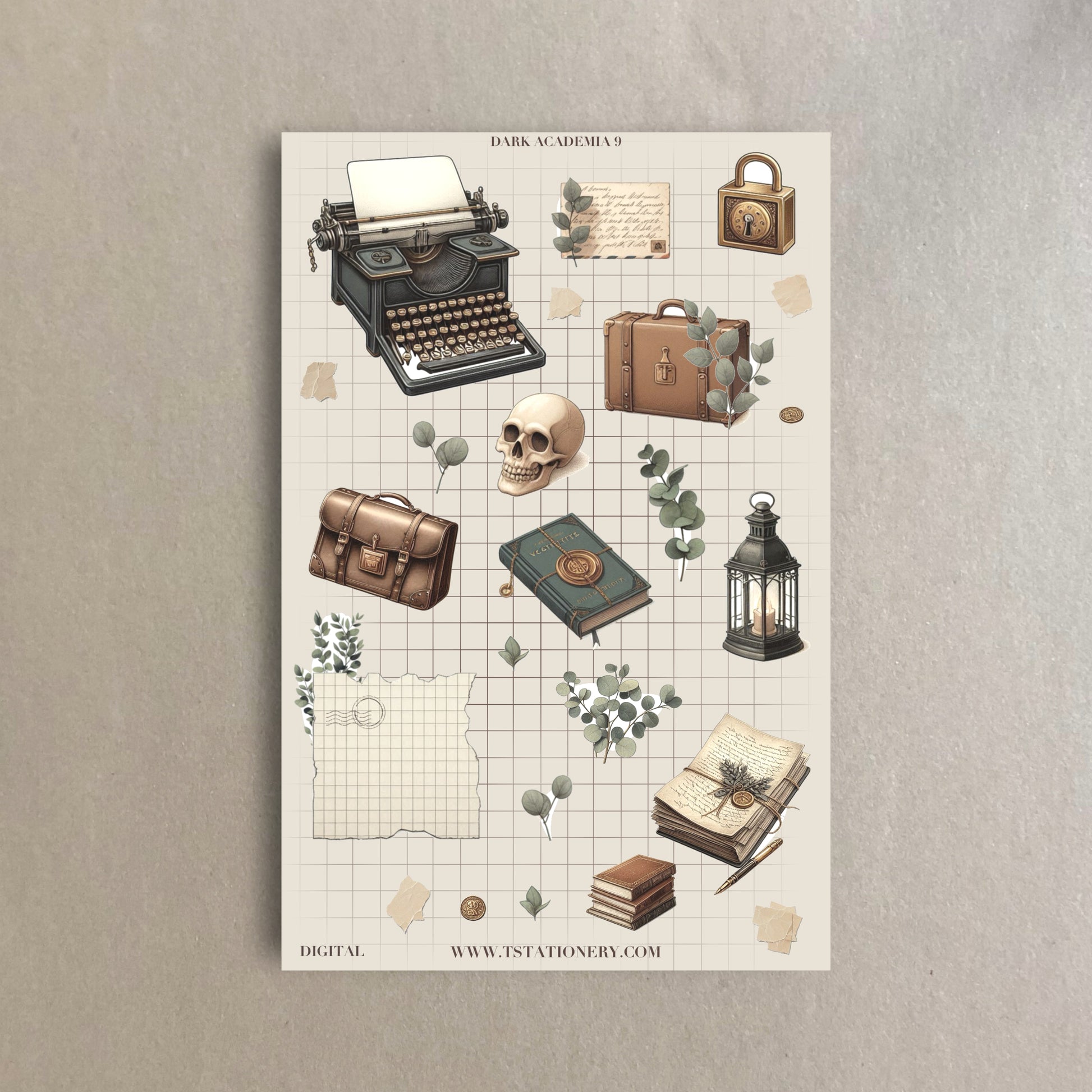 A dark academia sticker sheet, which is part of the new dark academia collection. It's perfect to use in your (reading) journal, planner or scrapbook. There are enough book stickers to play around with.