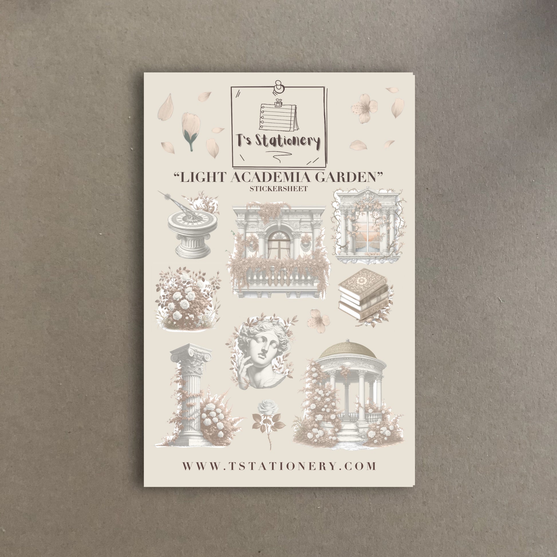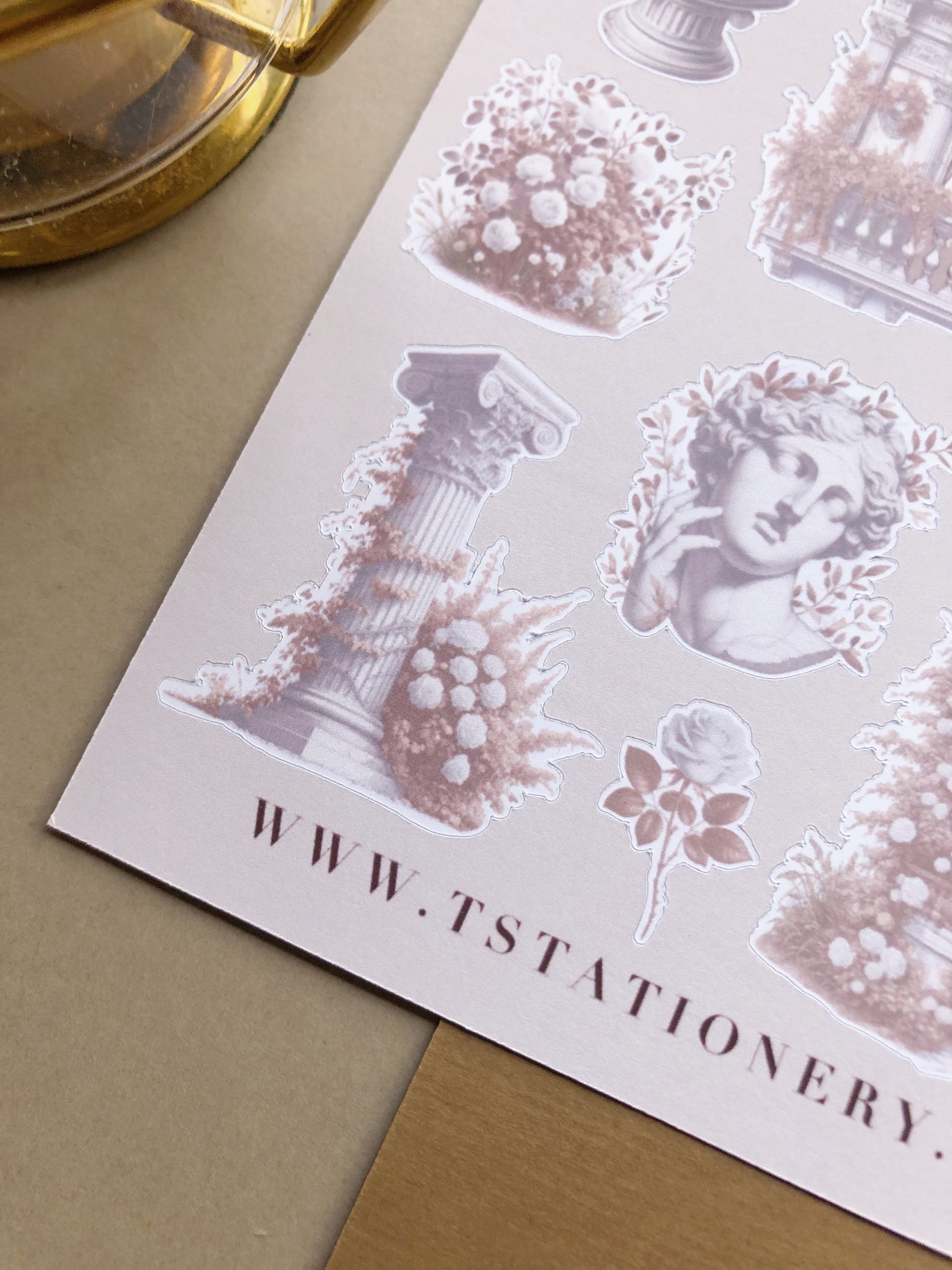 A light academia garden sticker sheet in spring, perfect to use in your journal, planner or scrapbook. There's also a certain ancient greek garden vibe to it!
