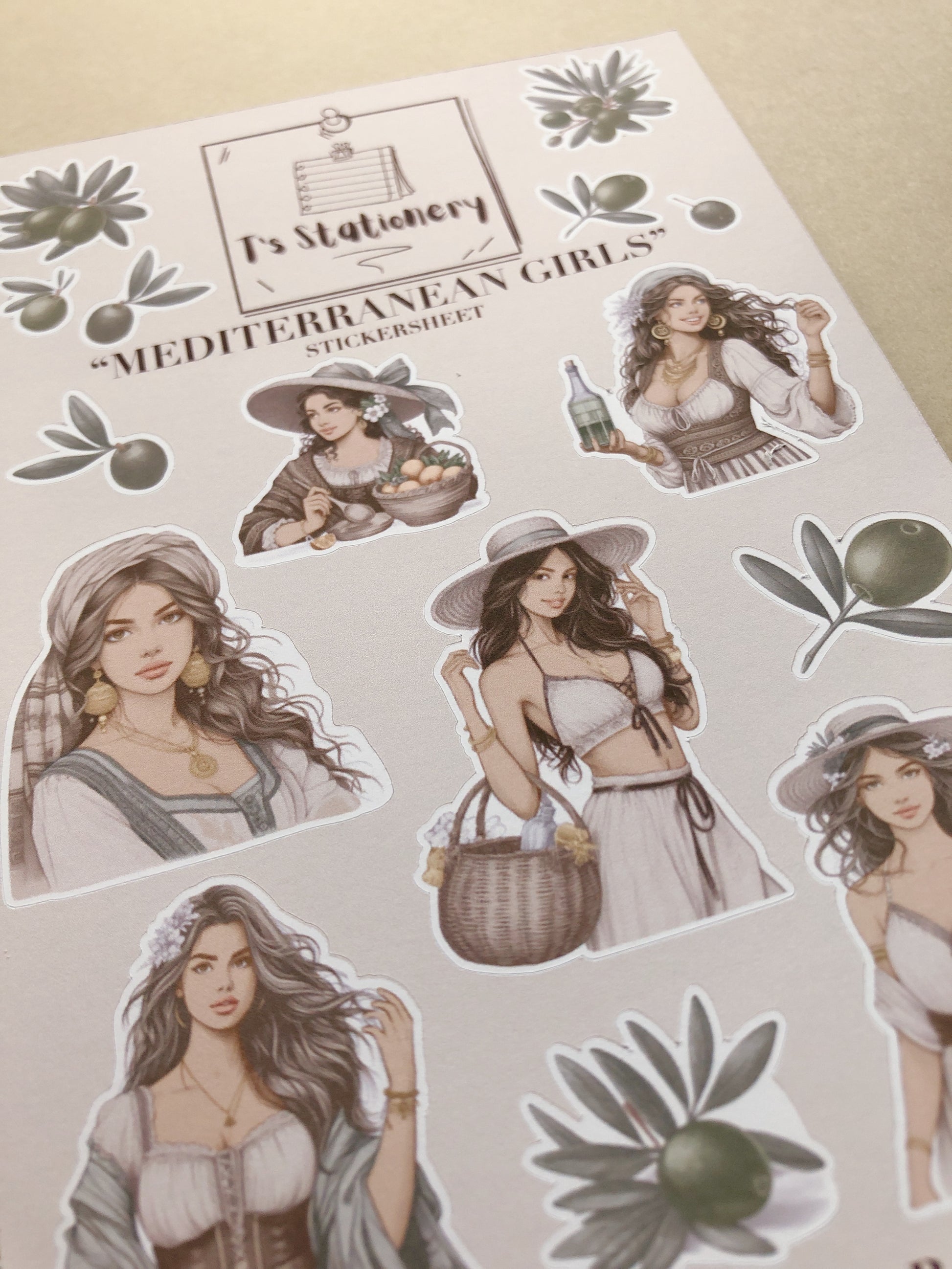 This girl sticker sheet is called "Mediterranean Girls" and contains 6 girl stickers and 9 olive stickers. Perfect to make pretty collages in your journal, planner or scrapbook during summer time.