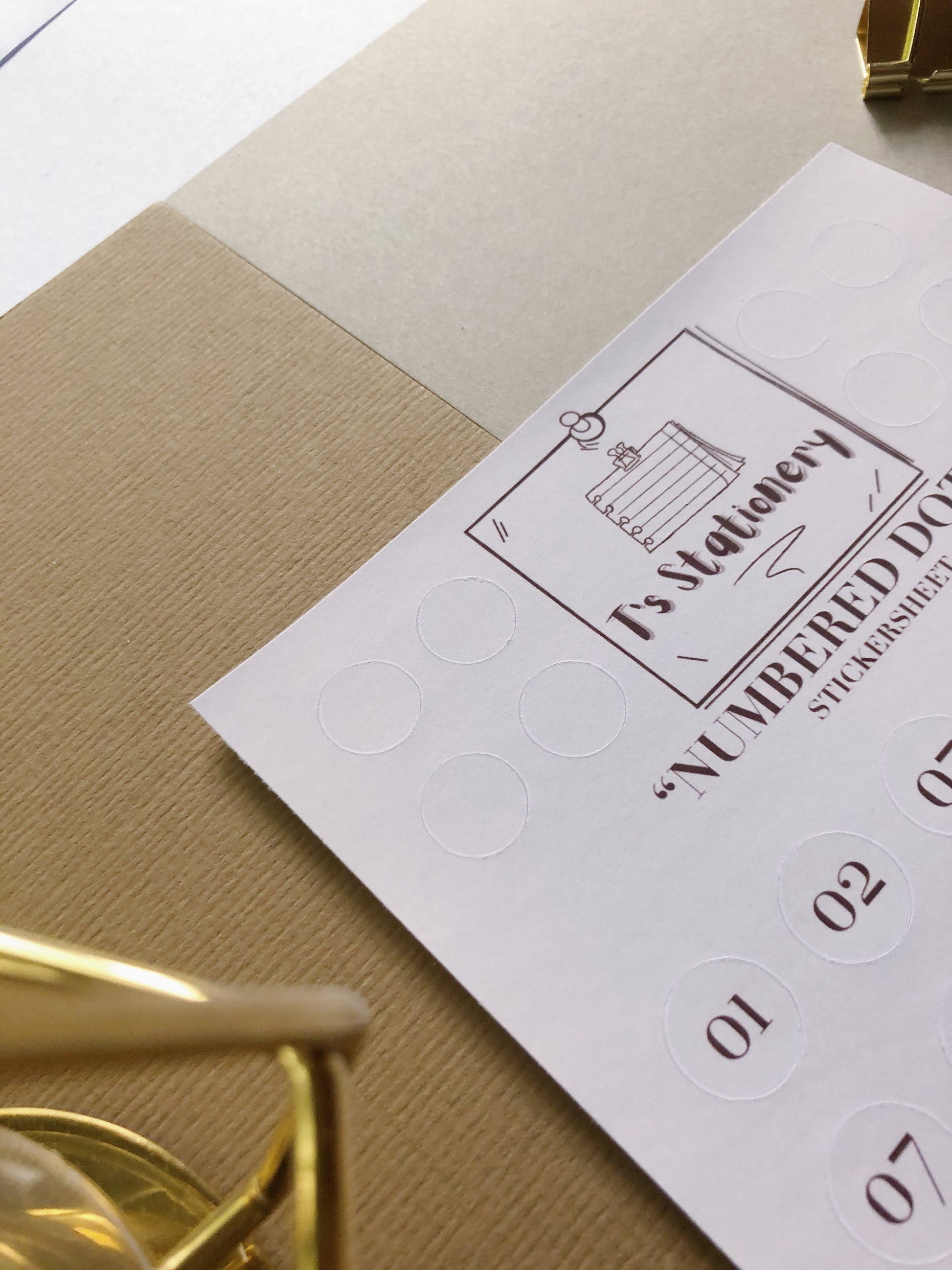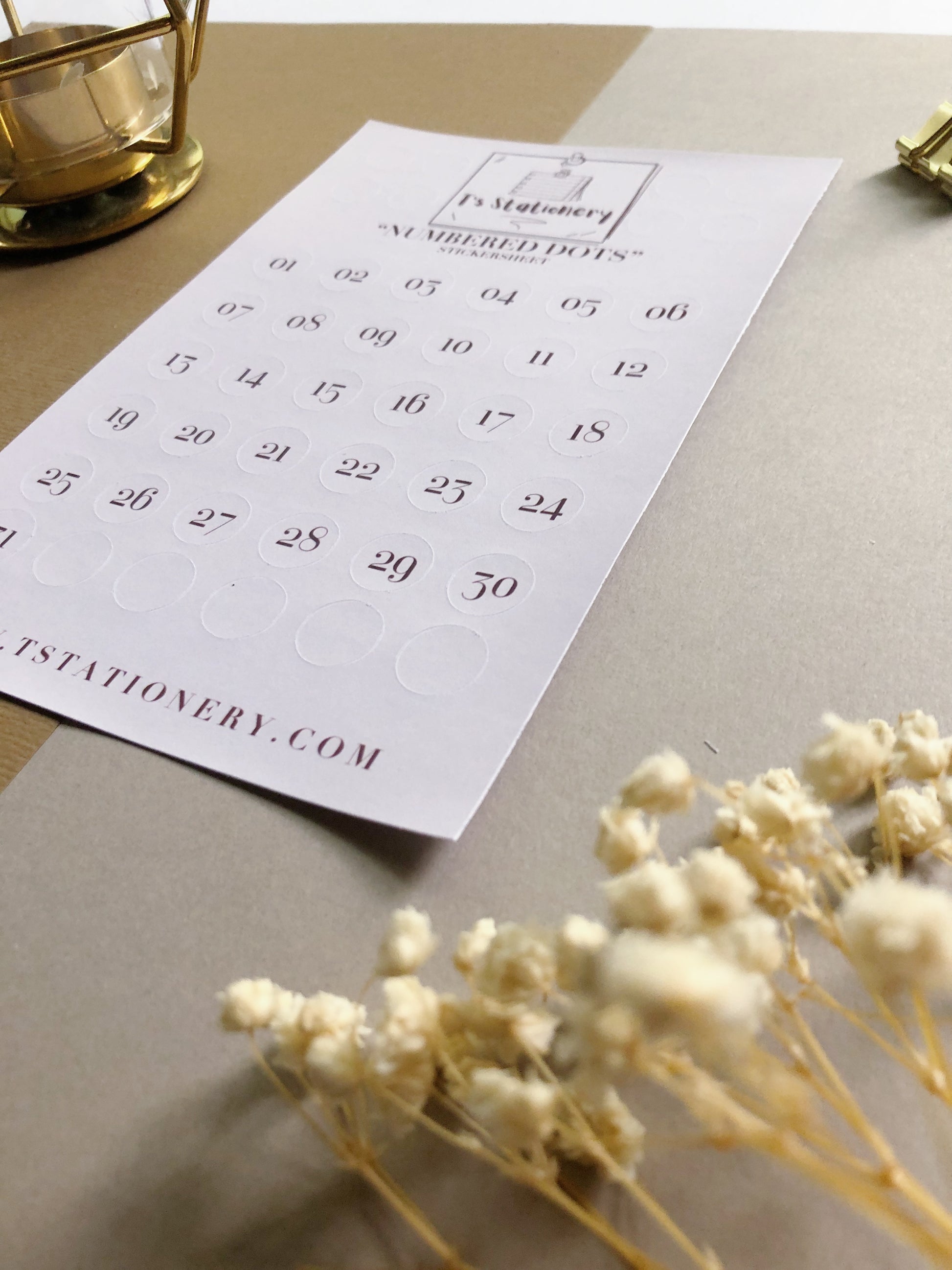 This sticker sheet contains dots with the numbers 01 - 31 and a few extra beige dots without numbers to set up a to do list for your self, or anything else you'd like to create with them :)