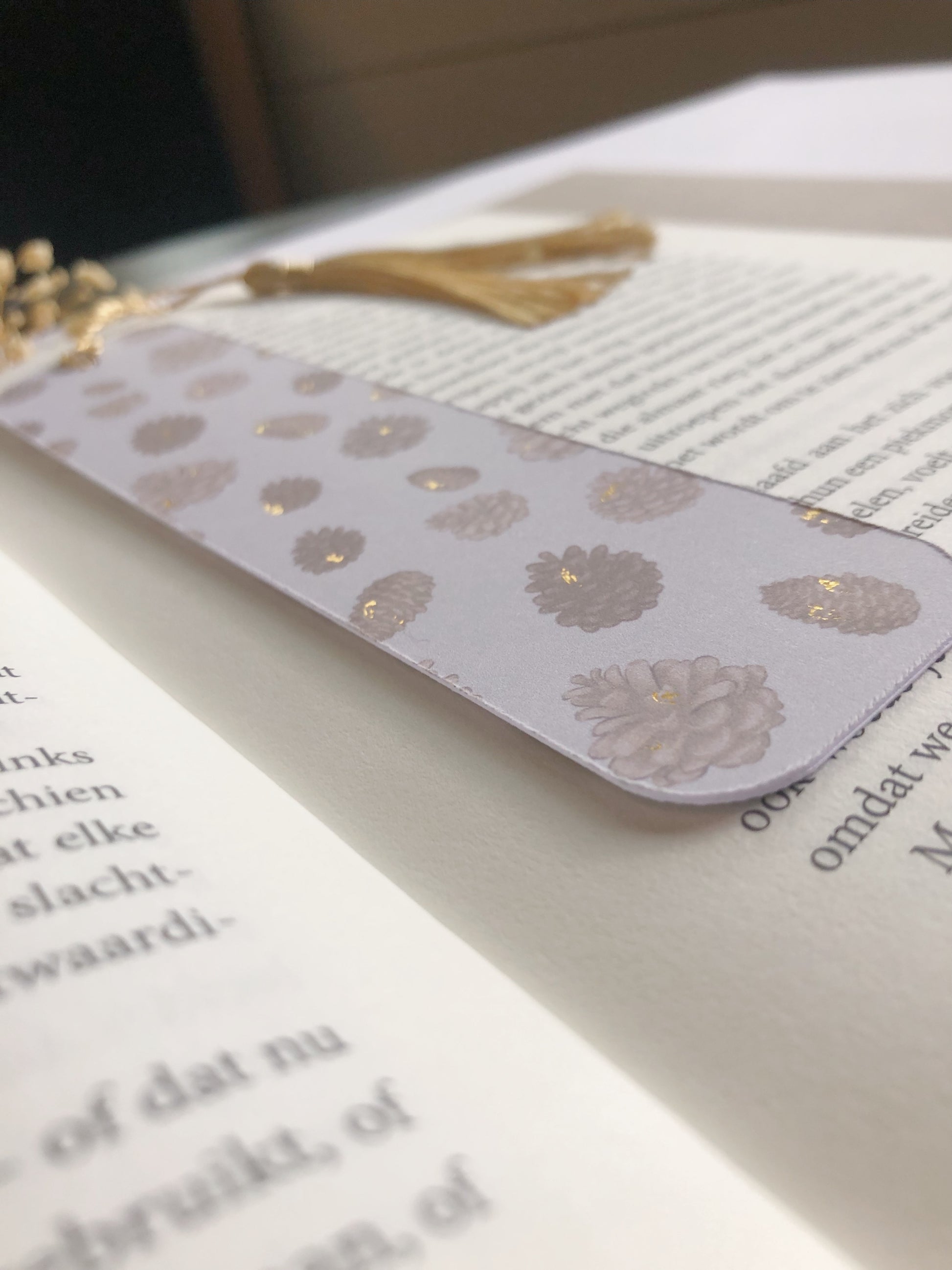 A bookmark with pinecones and gold foil sparkles. There's a golden tassel attached and the bookmark is made out of 2 sheets of paper, both with a thickness of 300 gsm. These sheets are firmly glued together which gives the bookmark a thickness of 600 gsm. The bookmark is not laminated but if you would want to do that yourself it is still possible, as the tassel can be removed very easily. The golden sparkles are added by hand so it can differ a bit on the product you will receive at home. Although, the same technique is applied so the overall look will remain the same. And the gold foil is applied on both sides!