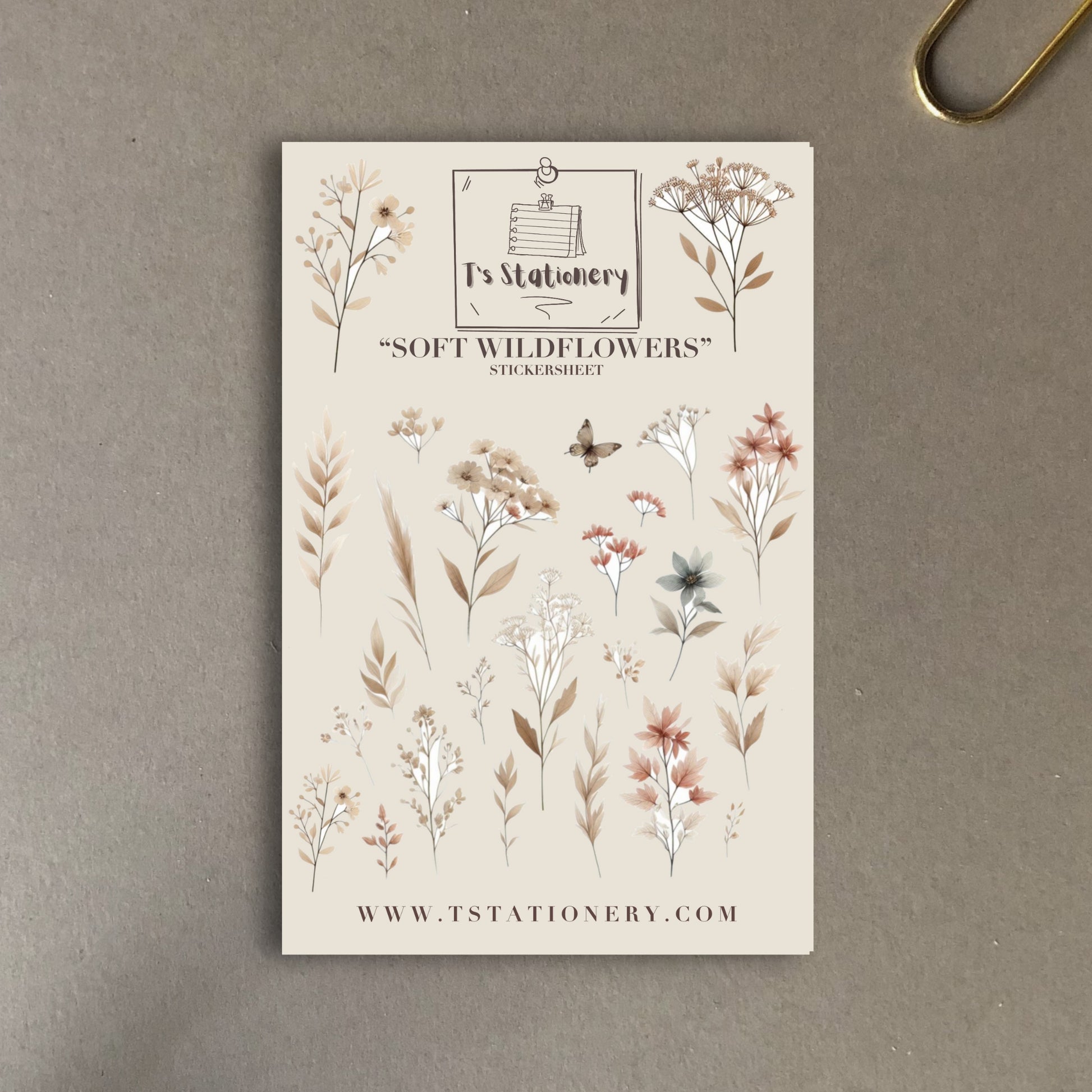 A spring-themed sticker sheet filled with beige and taupe wildflower stickers. These flower stickers are perfect for giving your journal, planner or scrapbook real spring vibes, they will keep your spreads neutral and not too crowded.