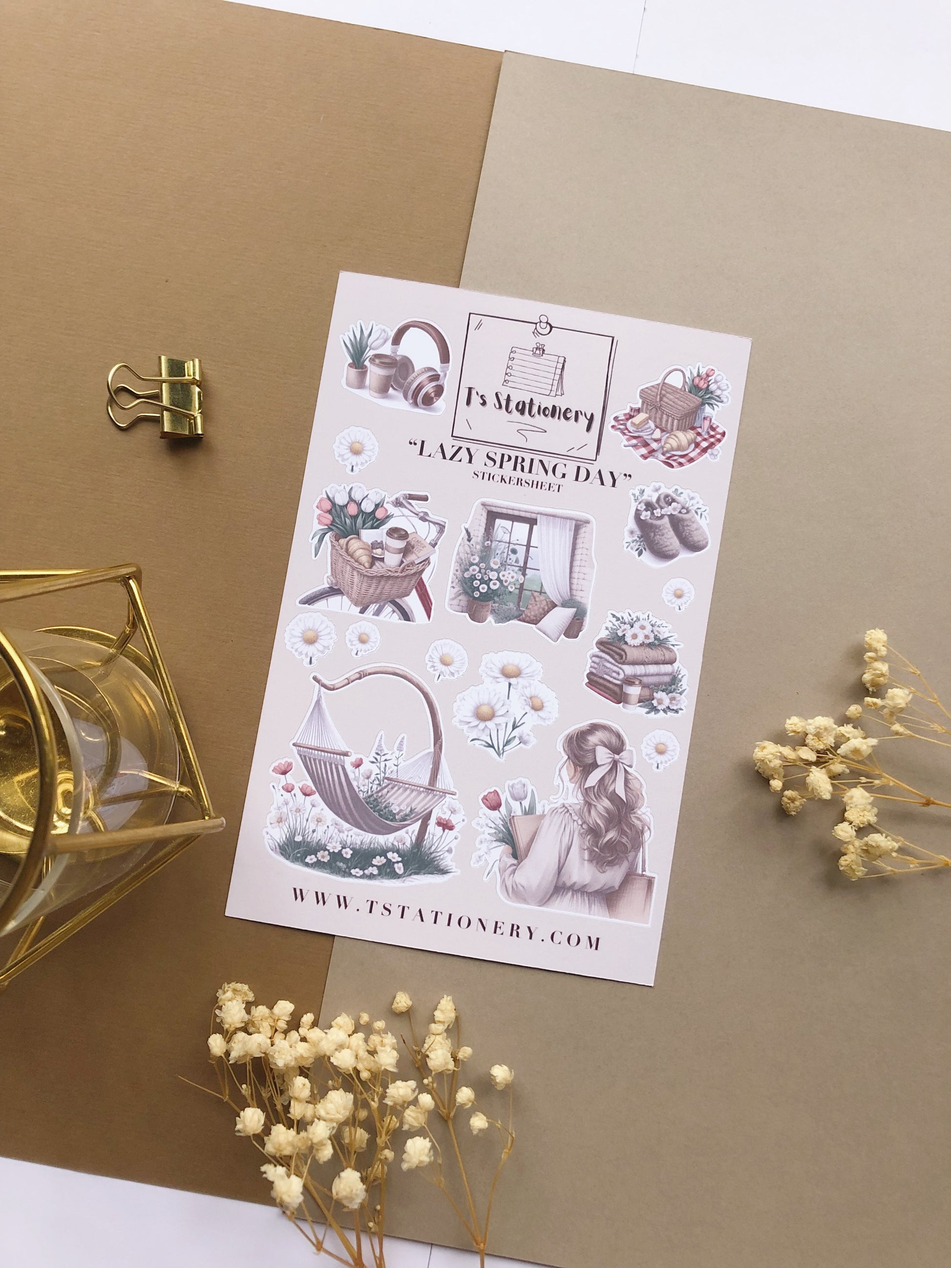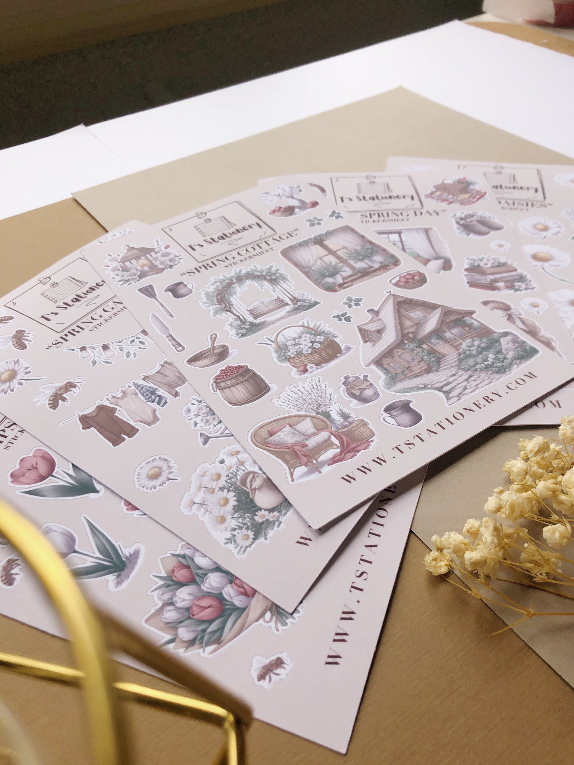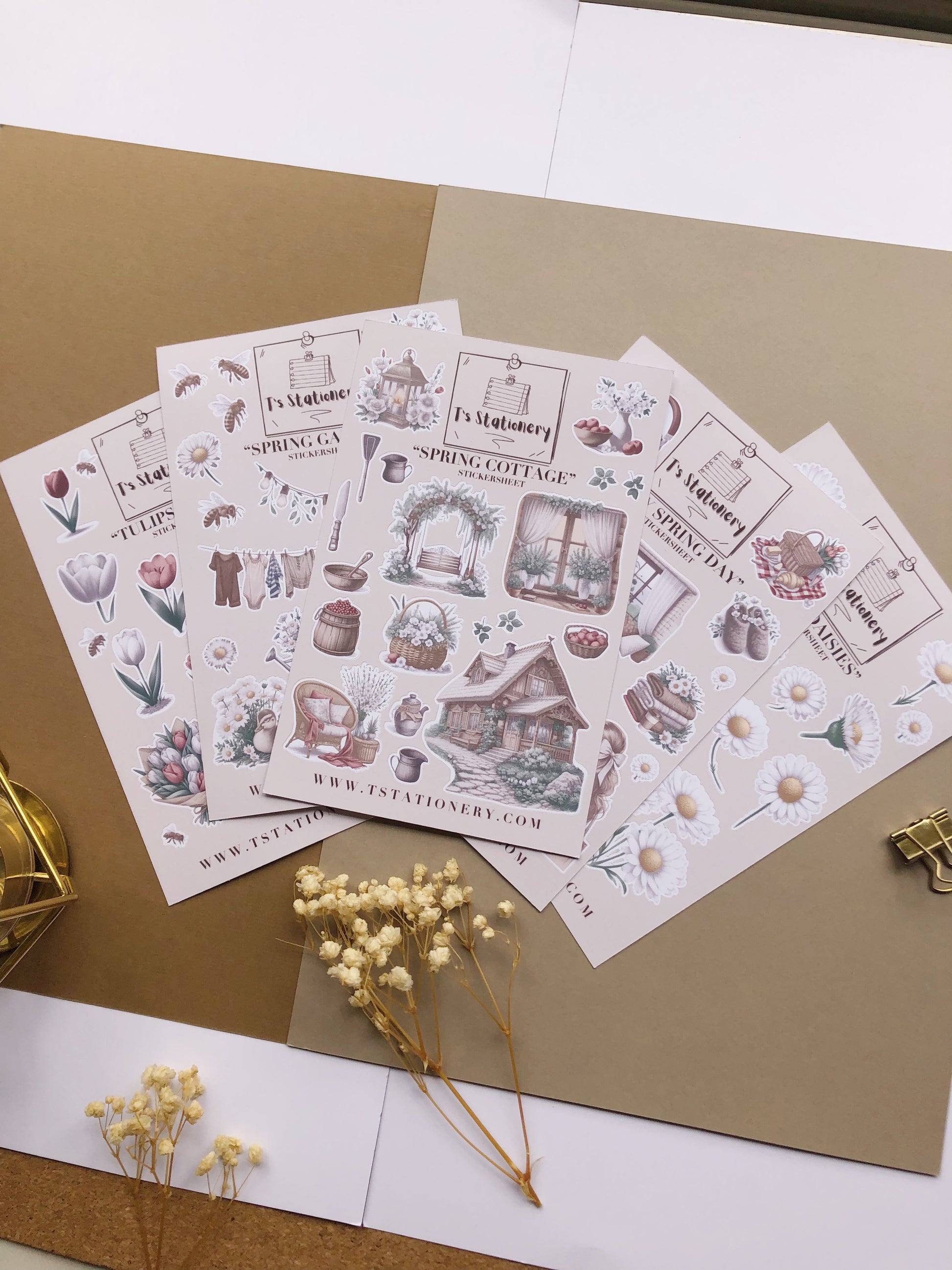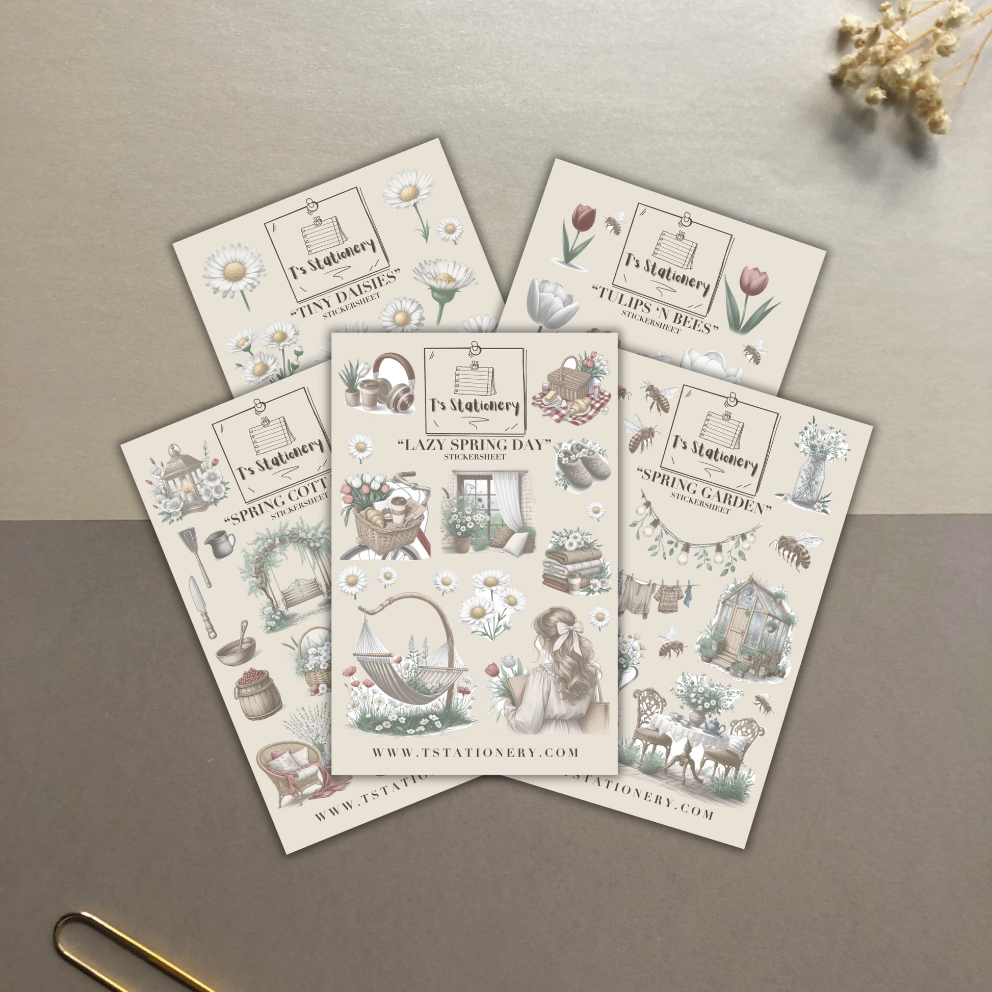 This spring sticker bundle of 5 sticker sheets has a total of 88 spring stickers! Enough decorative stickers to use in your journal, planner or scrapbook during spring time. This sticker set contains stickers such as: a hammock, a cozy spring cottage, lots of daisies and tulips, a bicycle basket with tulips and takeaway coffee, a super cute ducking sitting in between the daisies and much more! All in muted yet vibrant colors. This will give your spreads a chique and calm look.