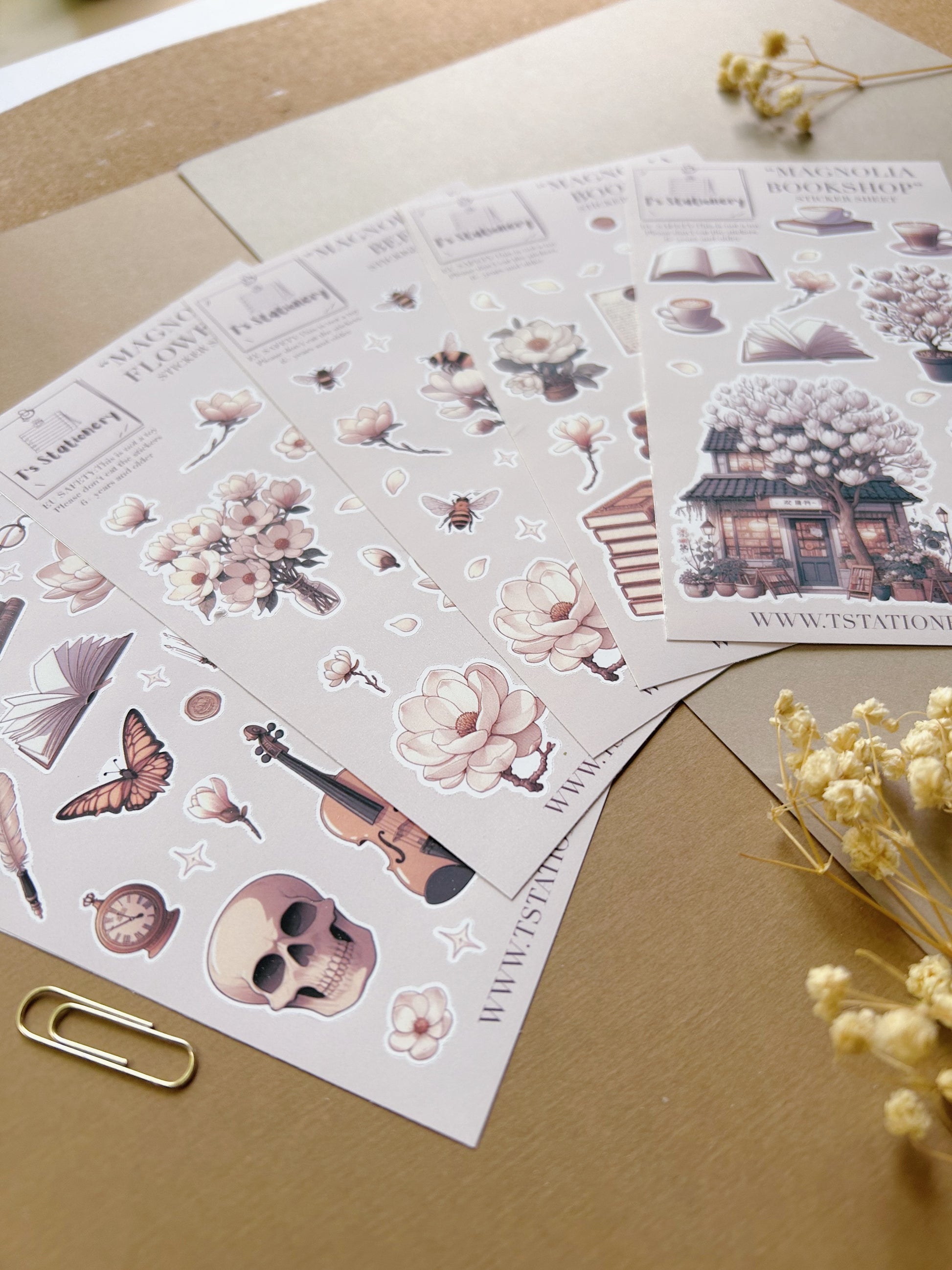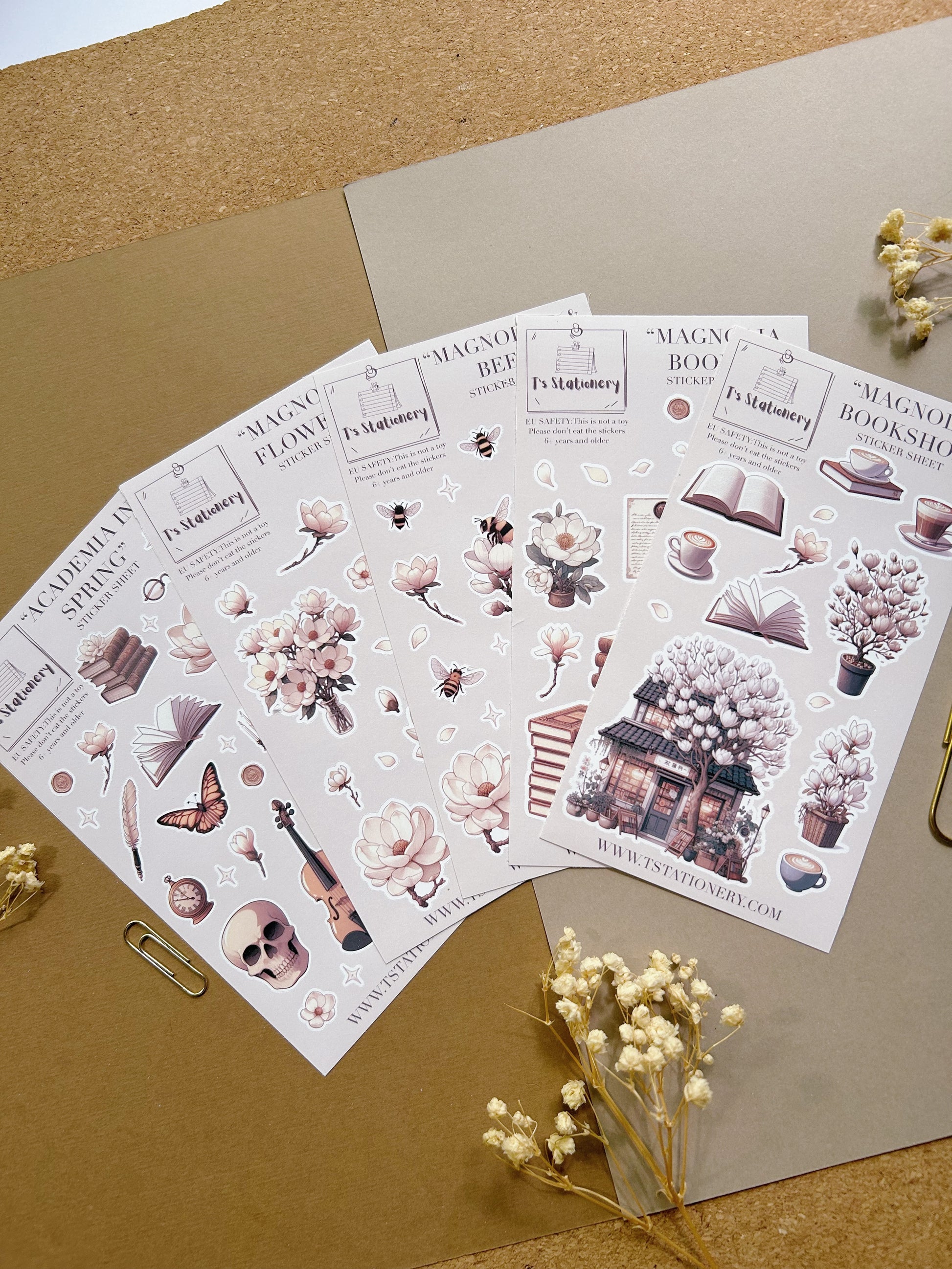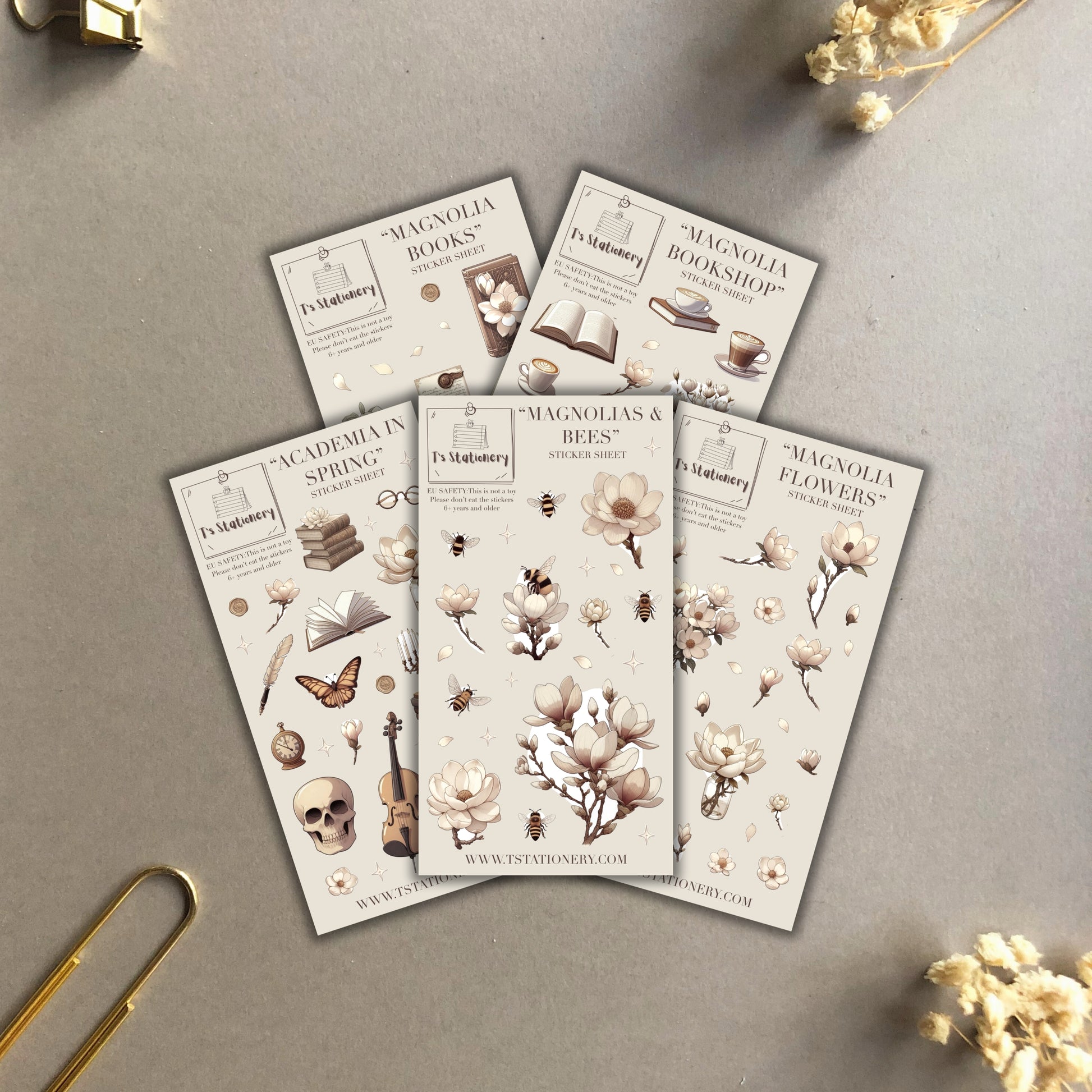 This spring sticker bundle of 5 sticker sheets has a total of 100 spring stickers! Enough decorative stickers to use in your journal, planner or scrapbook during spring time and summer. This sticker set contains stickers such as: lots of tiny bees, magnolia flowers, a bookshop, books, academia themed illustrations and much more! All in muted yet vibrant colors. This will give your spreads a chique and calm look.