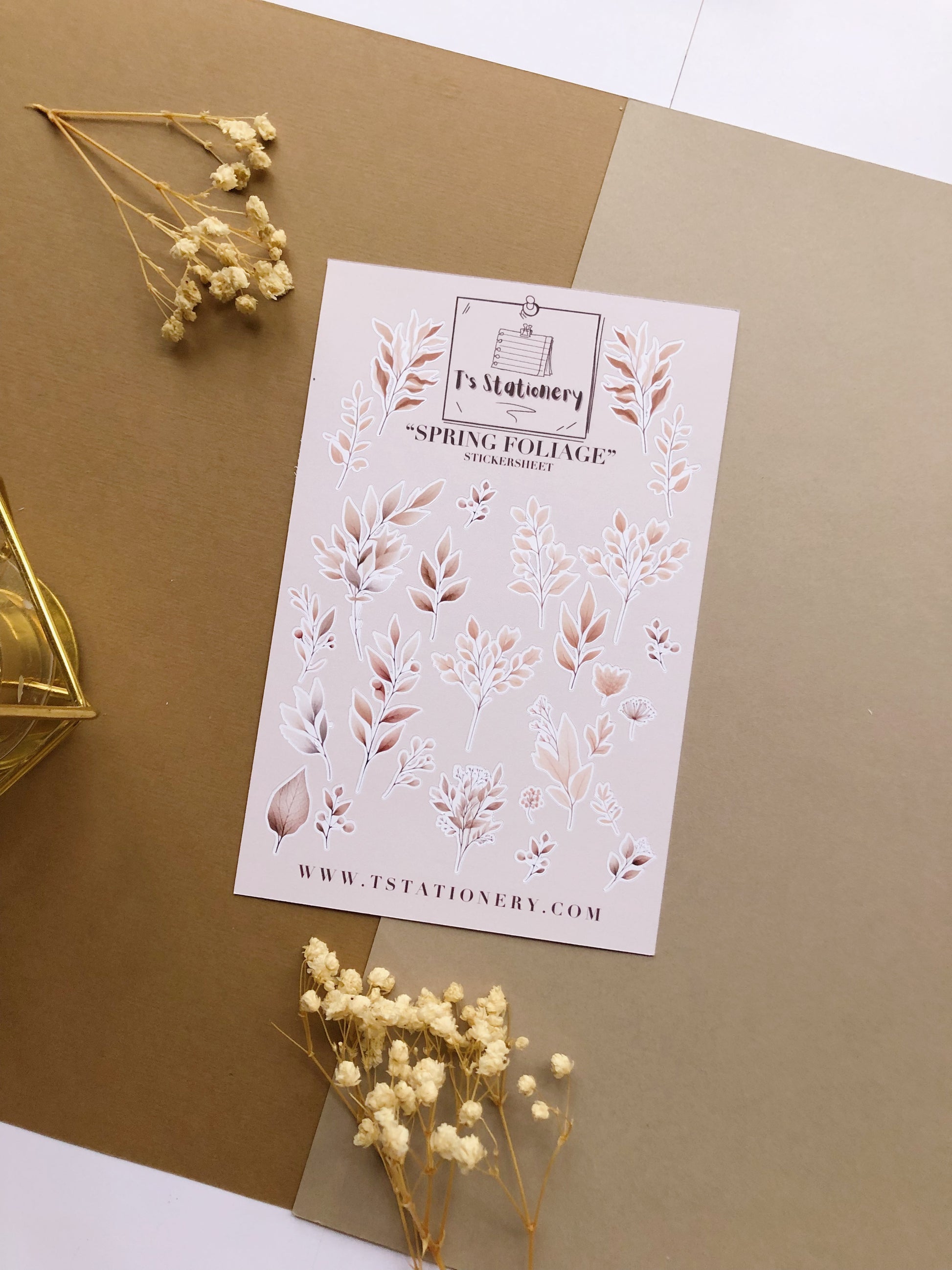 A spring-themed sticker sheet filled with beige and taupe foliage stickers. These foliage stickers are perfect for giving your journal, planner or scrapbook real spring vibes, they will keep your spreads neutral and not too crowded.