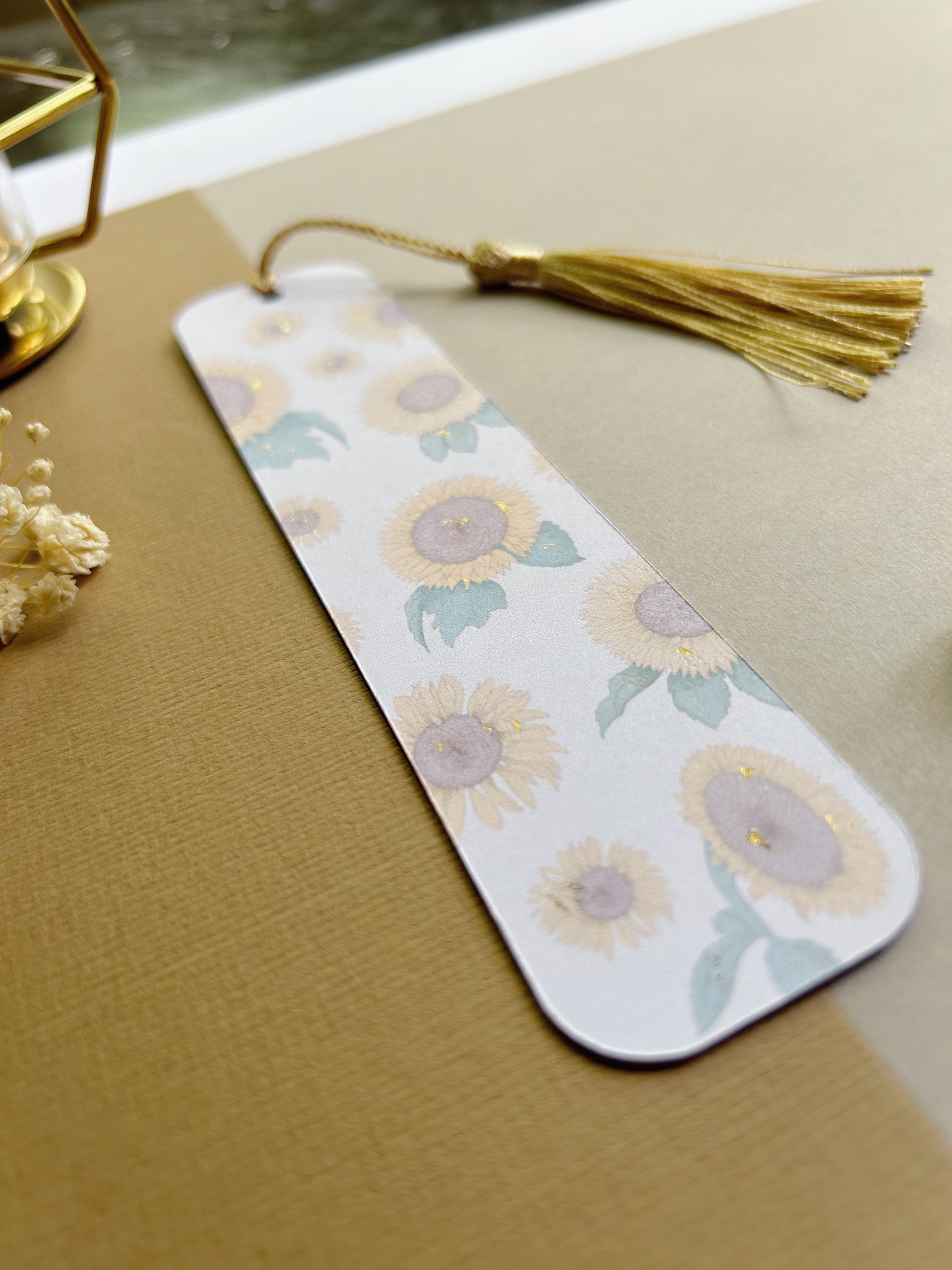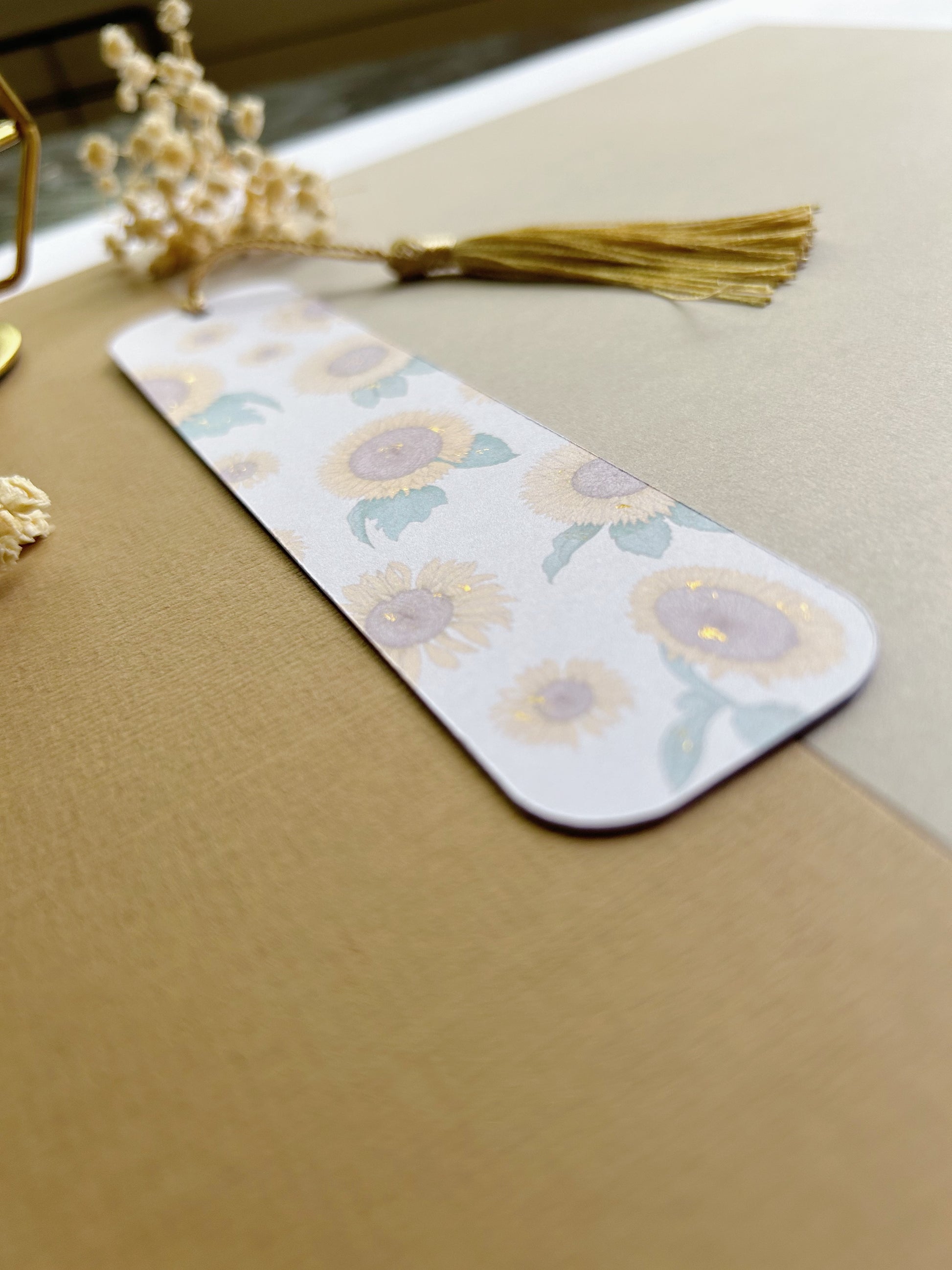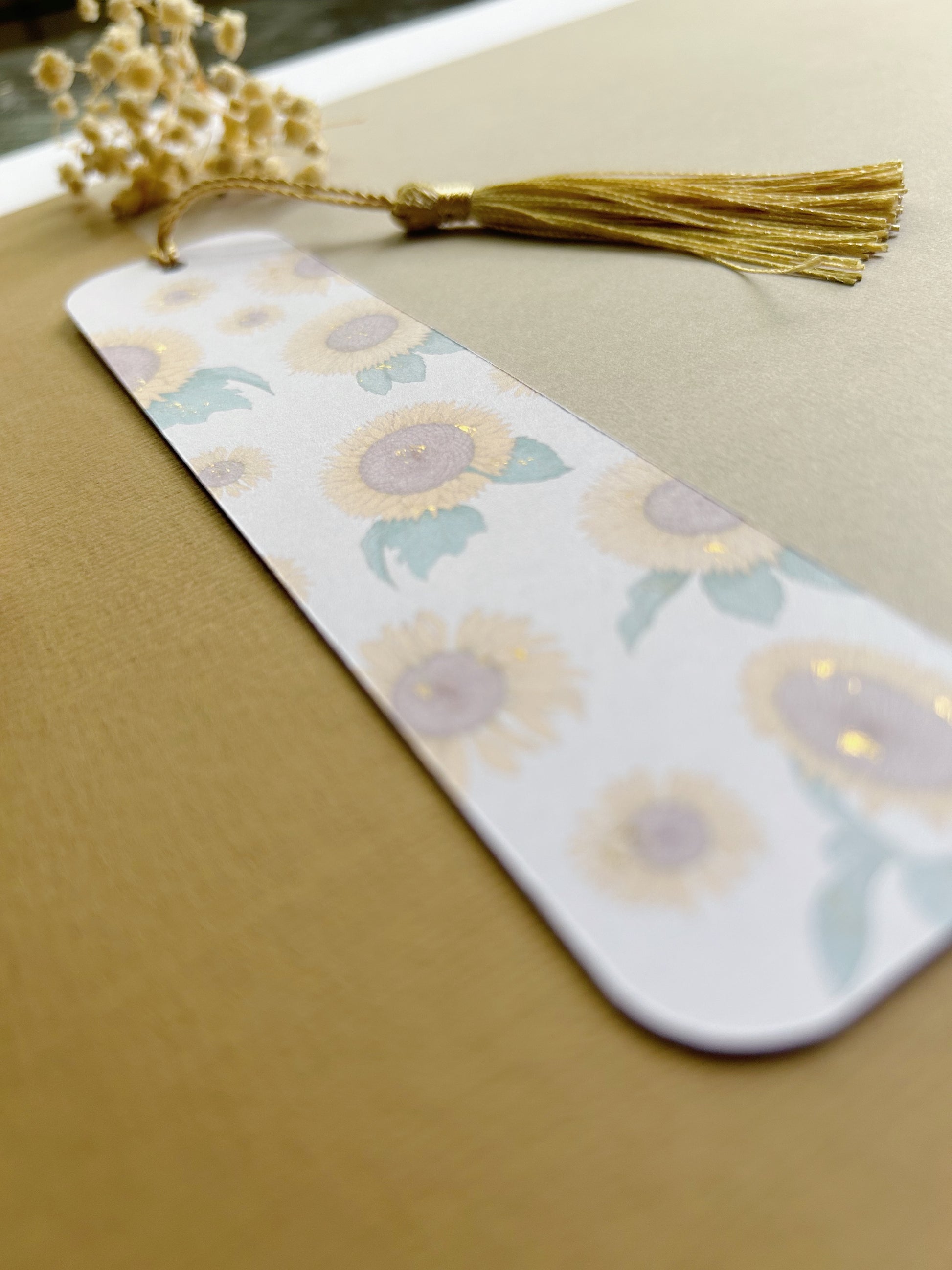 A bookmark with sunfowers and gold foil sparkles. There's a golden tassel attached and the bookmark is made out of 2 sheets of paper, both with a thickness of 300 gsm. These sheets are glued firmly together which gives the bookmark a thickness of 600 gsm. The bookmark is not laminated but if you would want to do that yourself it is still possible, as the tassel can be removed very easily. The golden sparkles are added by hand so it can differ a bit on the product you will receive at home. Although, the same technique is applied so the overall look will remain the same. And the gold foil is applied on both sides!