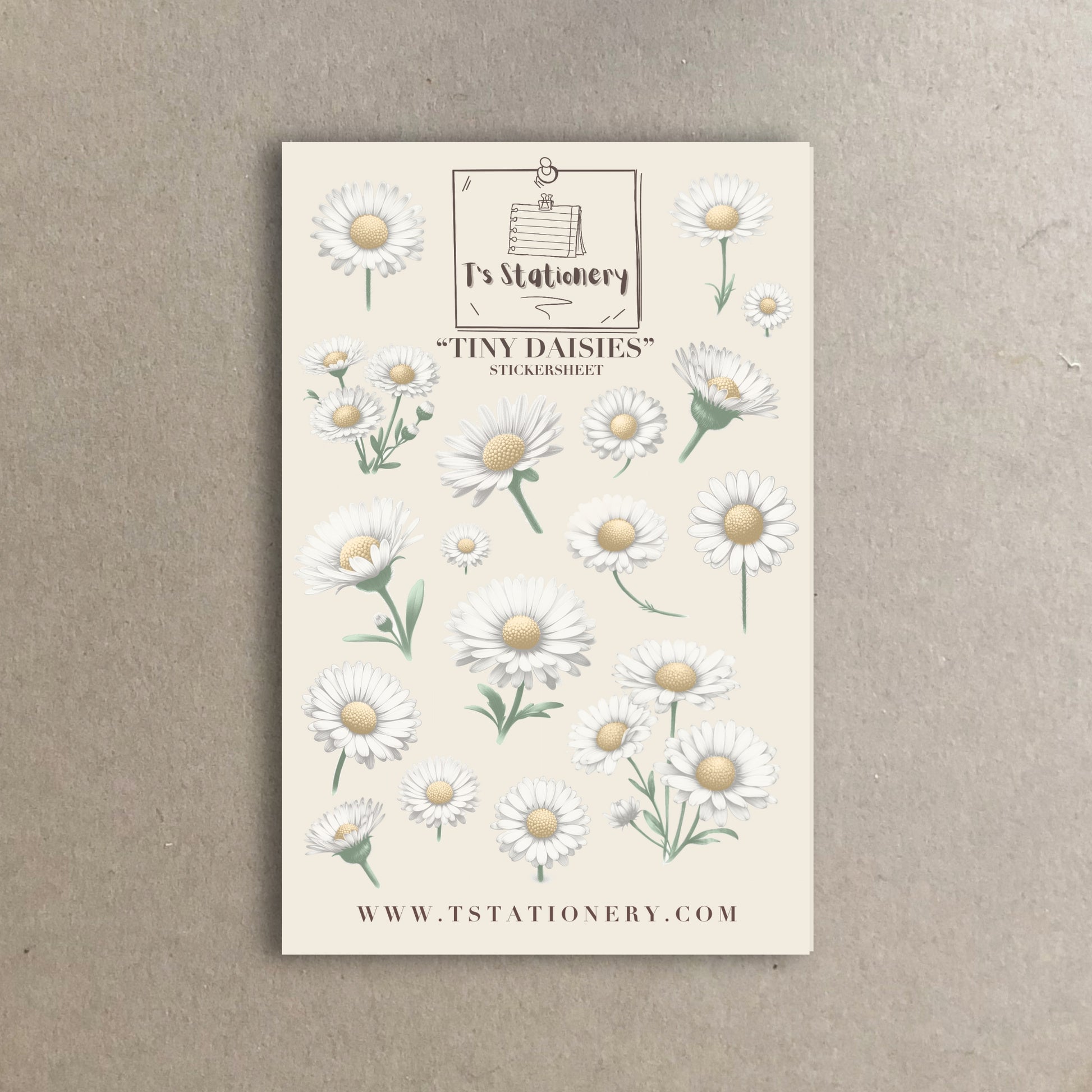 A spring-themed sticker sheet filled with white daisy stickers. These stickers are perfect for giving your journal, planner or scrapbook real spring vibes!