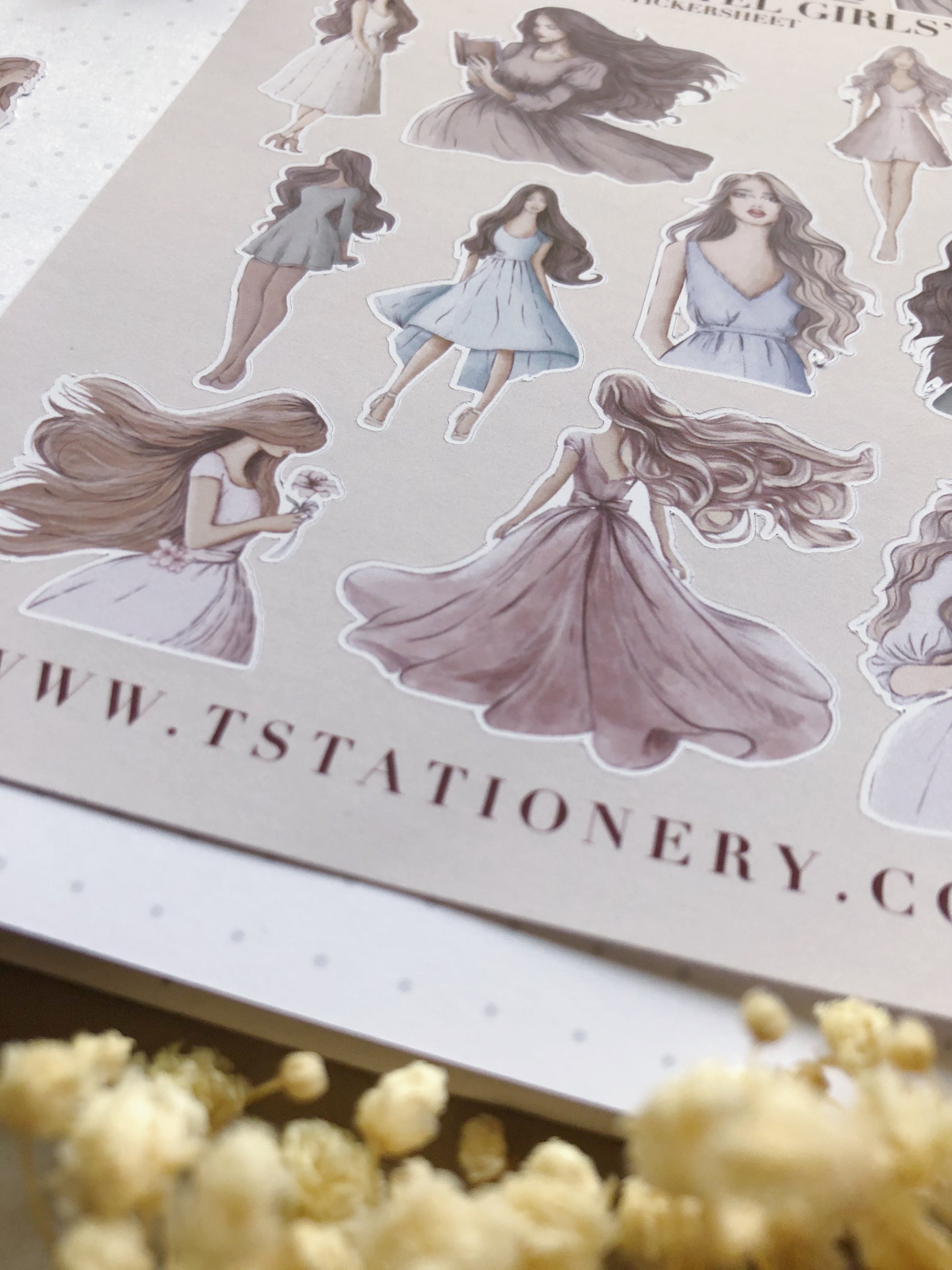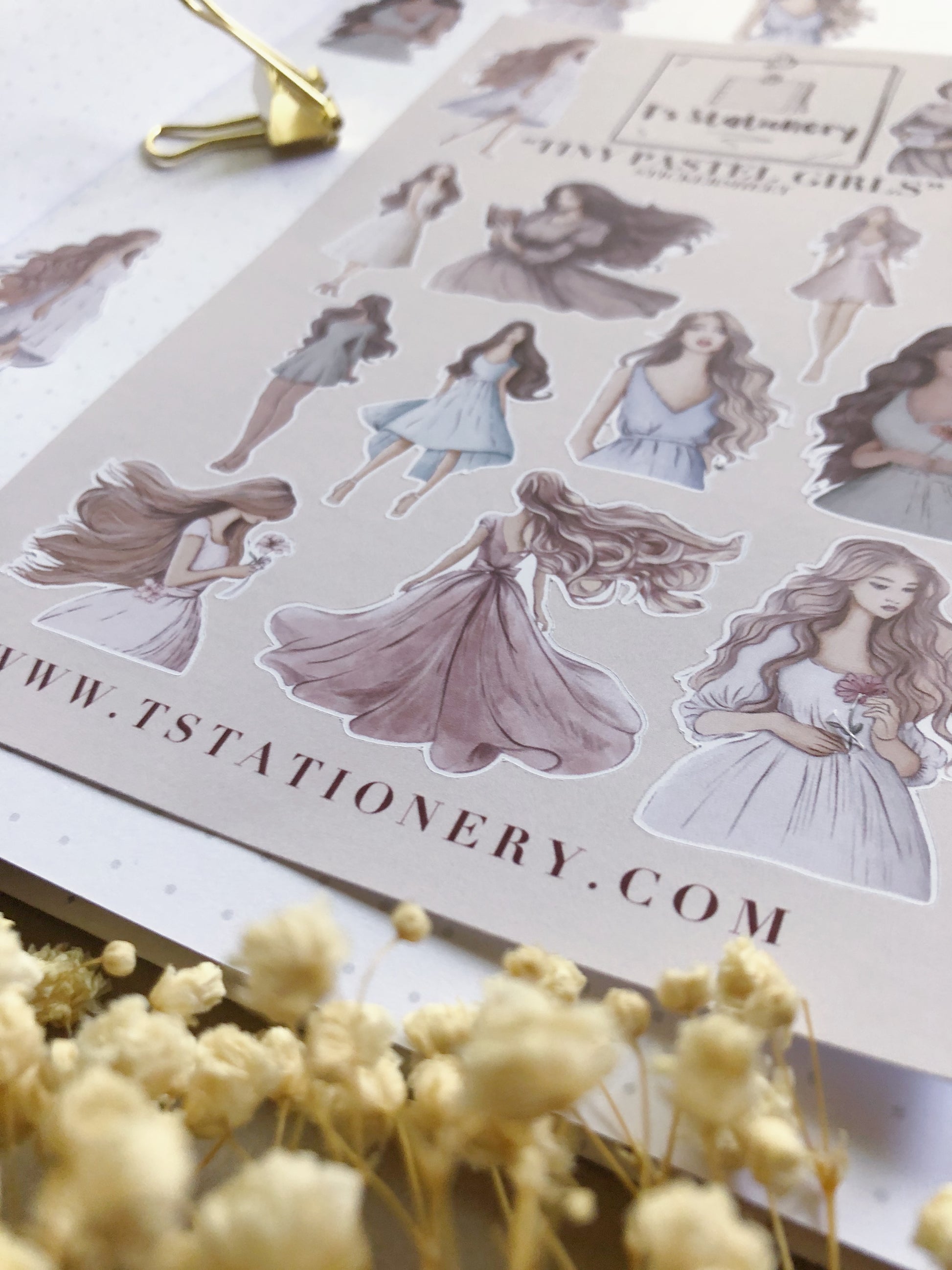 Some girls are a bit bigger and some are a bit smaller. I drew these stickers myself and I used my Cricut Maker to cut them. They all are kiss cut, and they have a small white lining at the sides.