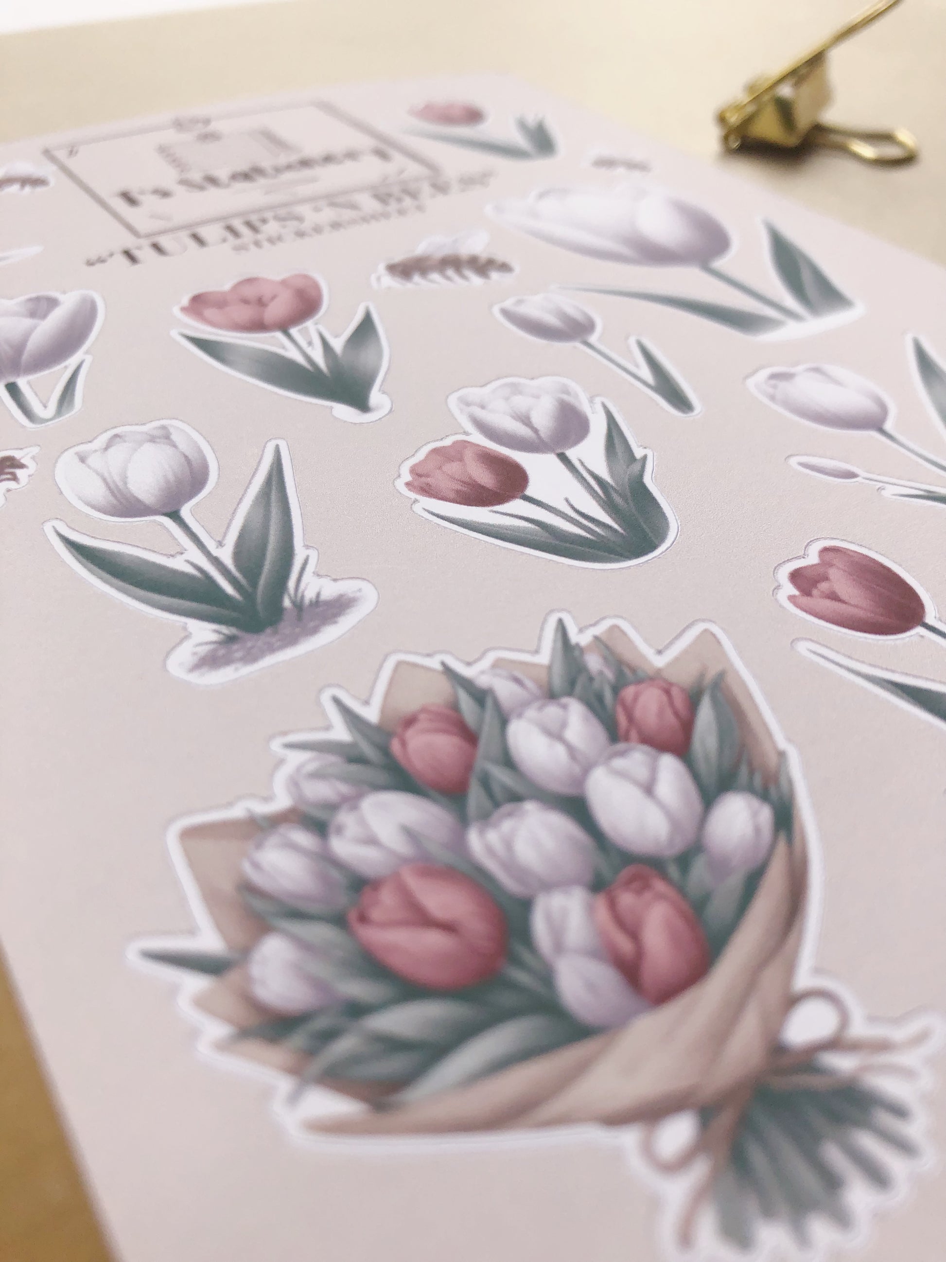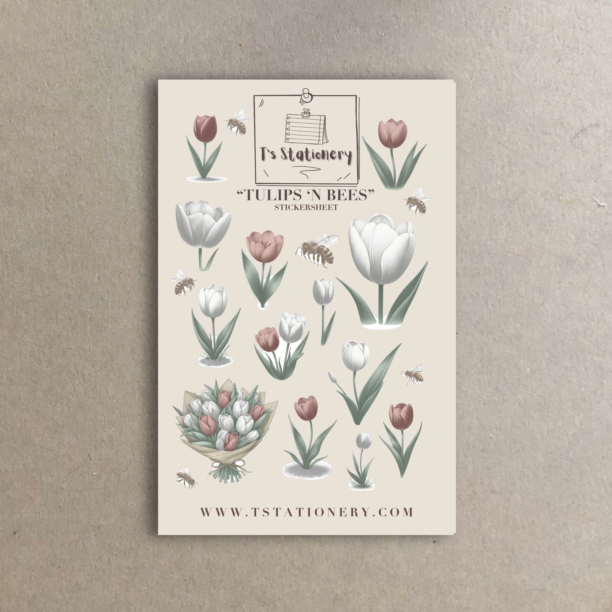 This Tulips 'n Bees sticker sheet will give your journal, planner or scrapbook real spring vibes. You can also use these stickers to apply onto your laptop or anywhere else where it isn't raining, they're not laminated so not waterproof :).